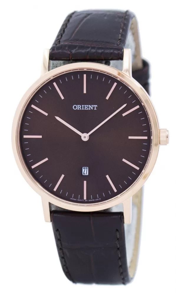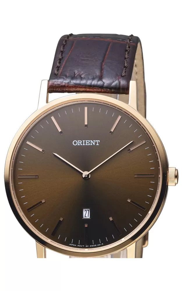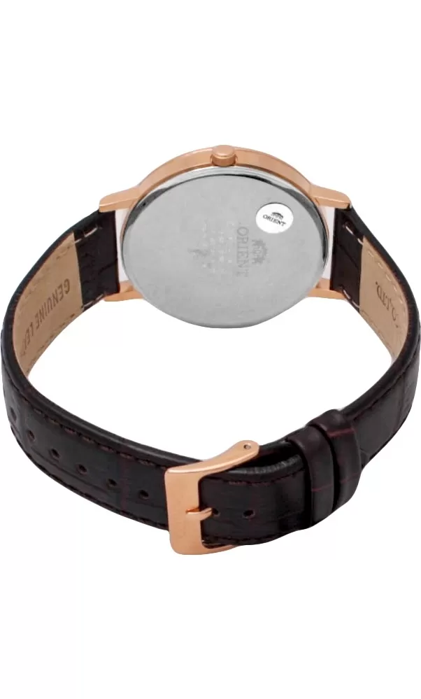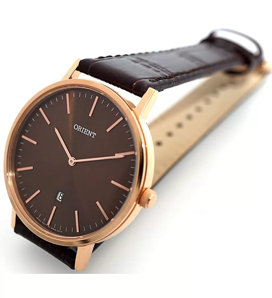 Minimalistické hodinky Orient nie sú ani nudné ani obyčajné. Spojenie kvalitného spracovania s designom od majstrov hodinárov z Japonska dostanete tento elegantný model hodiniek. Oceľové puzdro s ružovým PVD pozlátením, čierny kožený remienok a jednoduchý ciferník chránený minerálnym sklíčkom.