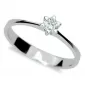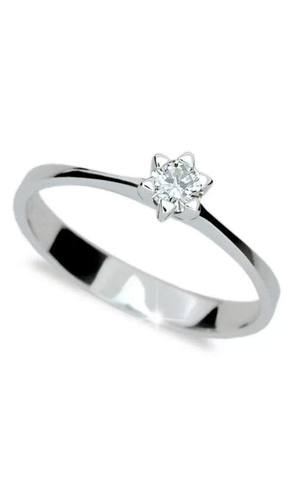 Dámsky prsteň je vyrobený z bieleho štrnásťkarátového zlata rýdzosti 585/1000 v lesklej povrchovej úprave s jedným okrúhlym diamantom briliantového brusu vsadeným do šesťkrapnovej korunky.