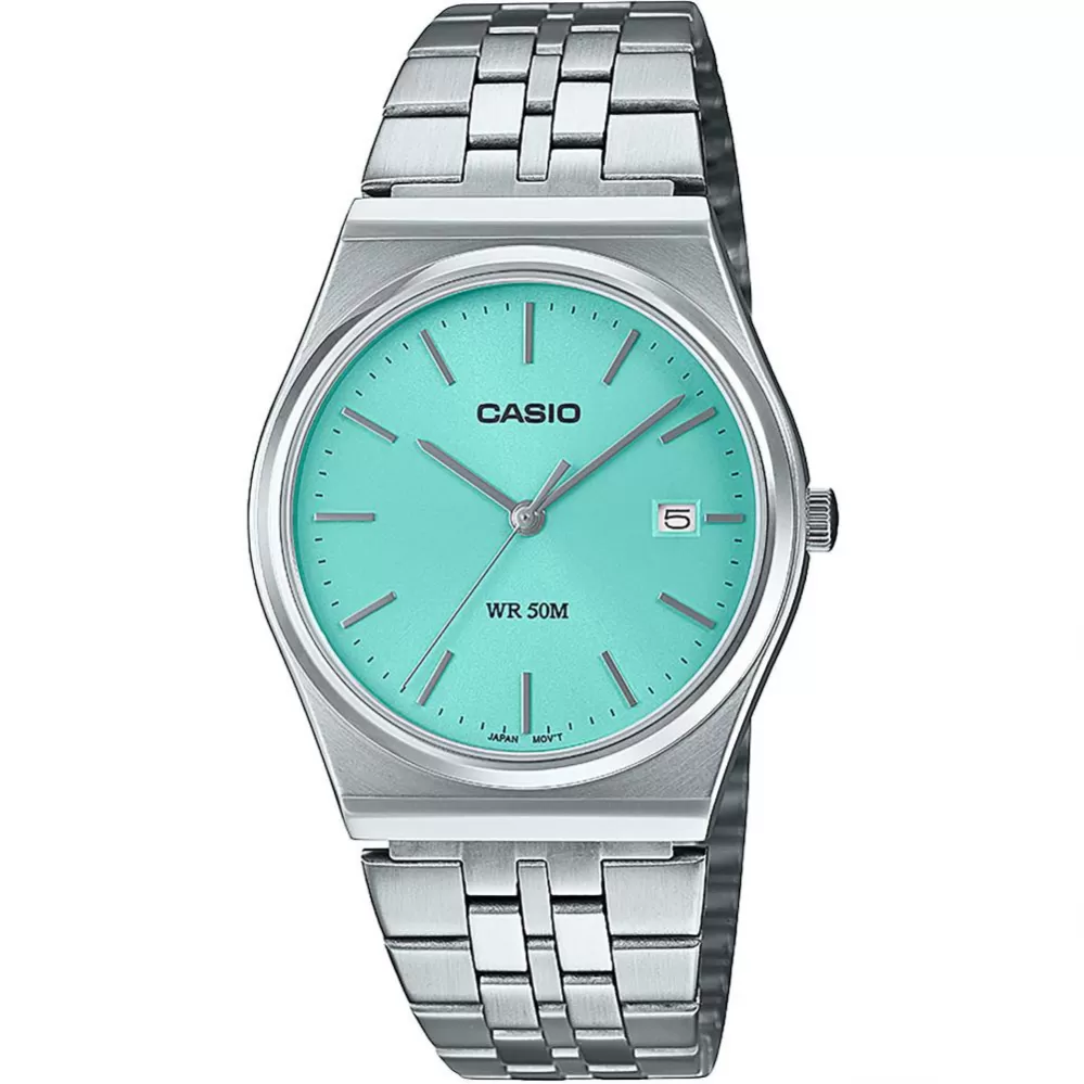 Jednoduché pánske hodinky Casio z kolekcie Collection. Hodinky majú oceľové puzdro a oceľový remienok av kombinácii s modrým ciferníkom. Hodinky disponujú ukazovateľom dátumu.