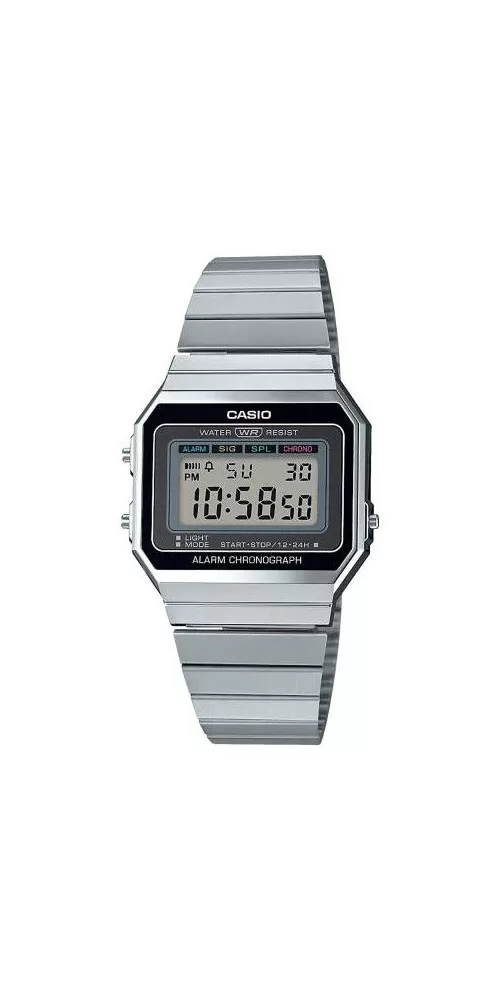 Unisex digitálne hodinky z kolekcie CASIO Vintage. Hodinky v retro štýle s plastovým puzdrom a oceľovým remienkom. Vodotesnosť týchto hodiniek je pod označením 30M, teda použitie je vhodné iba pri umývaní rúk alebo ľahkom daždi.