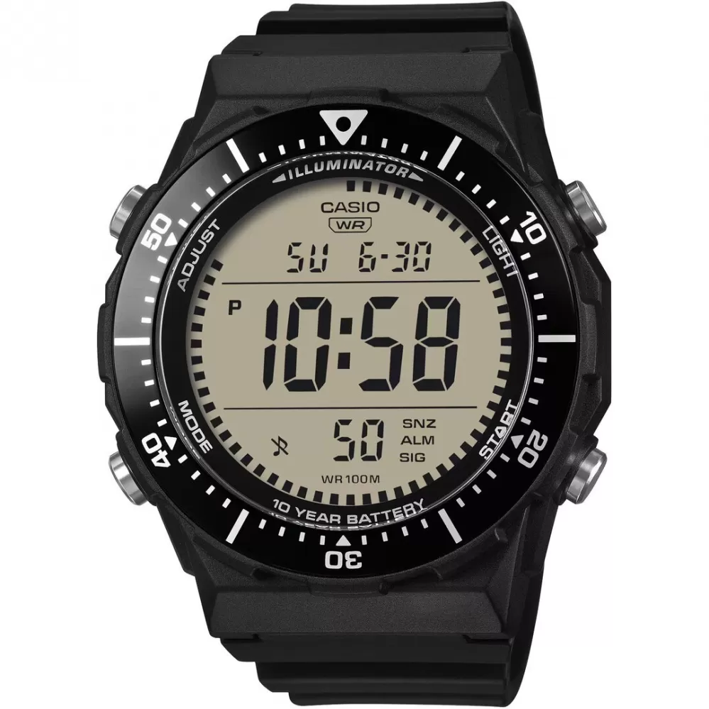 Pánske náramkové hodinky Napájanie z batérie Pohyb 3580 Priemer púzdra 47,3 mm Puzdro v tvare kruhu Plastové puzdro ČIERNA farba puzdra Plastový zdvih ČIERNA farba ťahu Digitálny ciferník Ciferník s arabskými číslicami Materiál skla - plast Vodeodolný pri plávaní Dátum Stopky Odpočítavacie stopky s opakovaním LED podsvietenie displeja 3 multi-budíky Druhýkrát