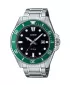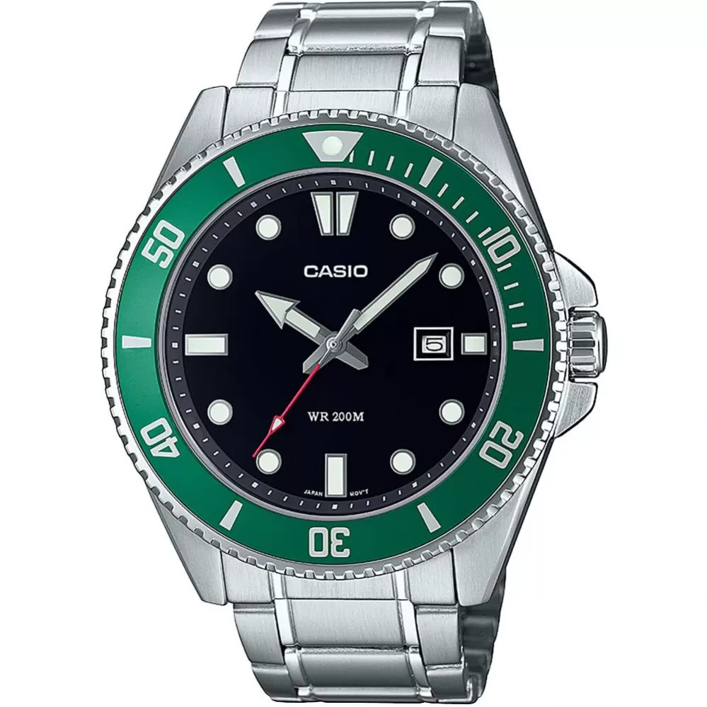 Casio Collection MDV-107D-3AVEFdisponujú ukazovateľom dátumu na pozícii tretej hodiny. lemované jednosmerne otočnou potápačskou lunetou v zelenej farbe. Vodotesnosť tohto modelu je 200 m, s hodinkami je možné plávať.