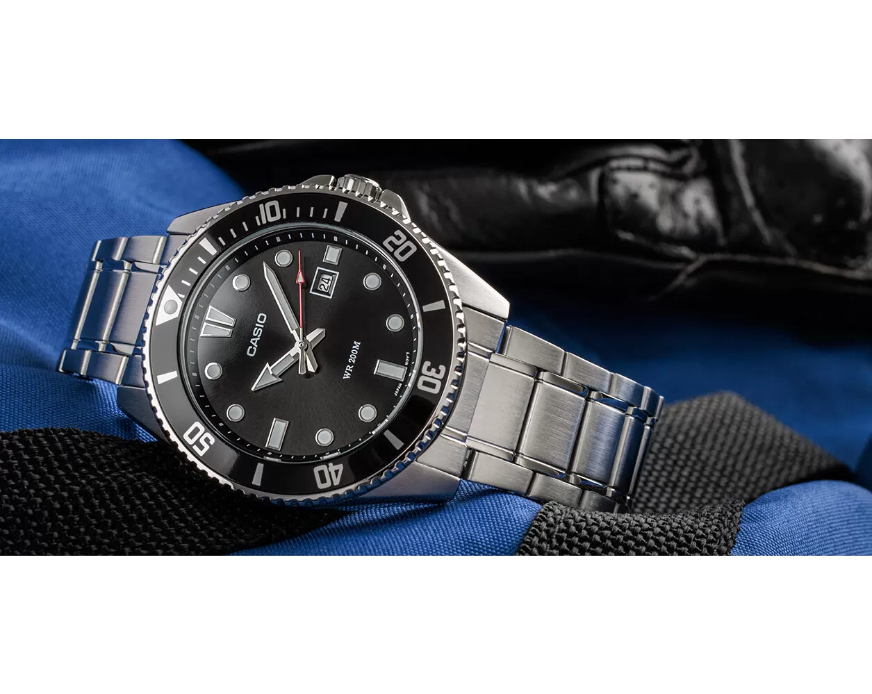 Casio Collection MDV 107D-1A1Vdisponujú ukazovateľom dátumu na pozícii tretej hodiny. Ciferník je inšpirovaný potápačskými modelmi a vyniká skvelou prehľadnosťou a pôsobí prehľadne za čo môže vďačiť výrazným indexom a ručičkám s luminiscenciou. Sklíčko je lemované jednosmerne otočnou potápačskou lunetou v čiernej farbe. Vodotesnosť tohto modelu je 200 m, s hodinkami je možné plávať. Vodotesnosť je podporená skrutkovacou korunkou a tekvičkou.
