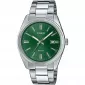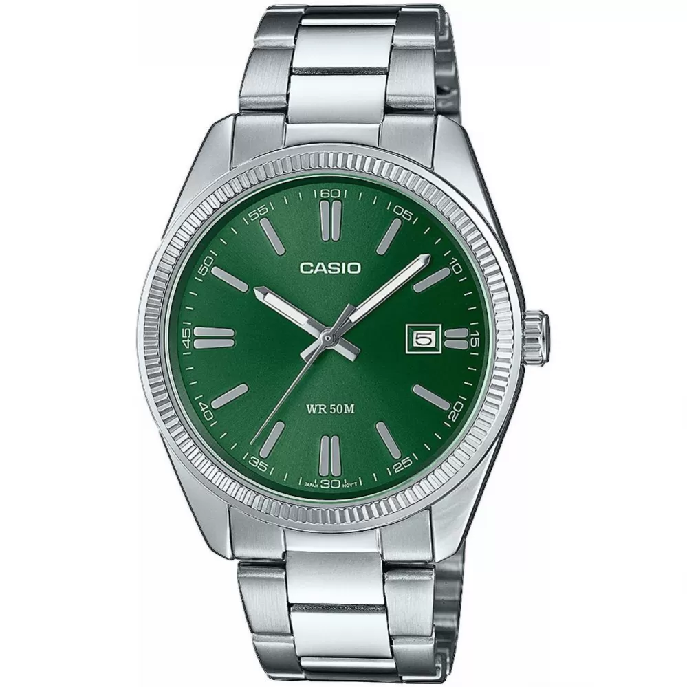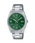 Jednoduché pánske hodinky Casio z kolekcie Collection. Hodinky majú mosadzné puzdro v striebornej farbe v kombinácii s oceľovým remienkom a zeleným ciferníkom. Hodinky disponujú ukazovateľom dátumu.