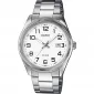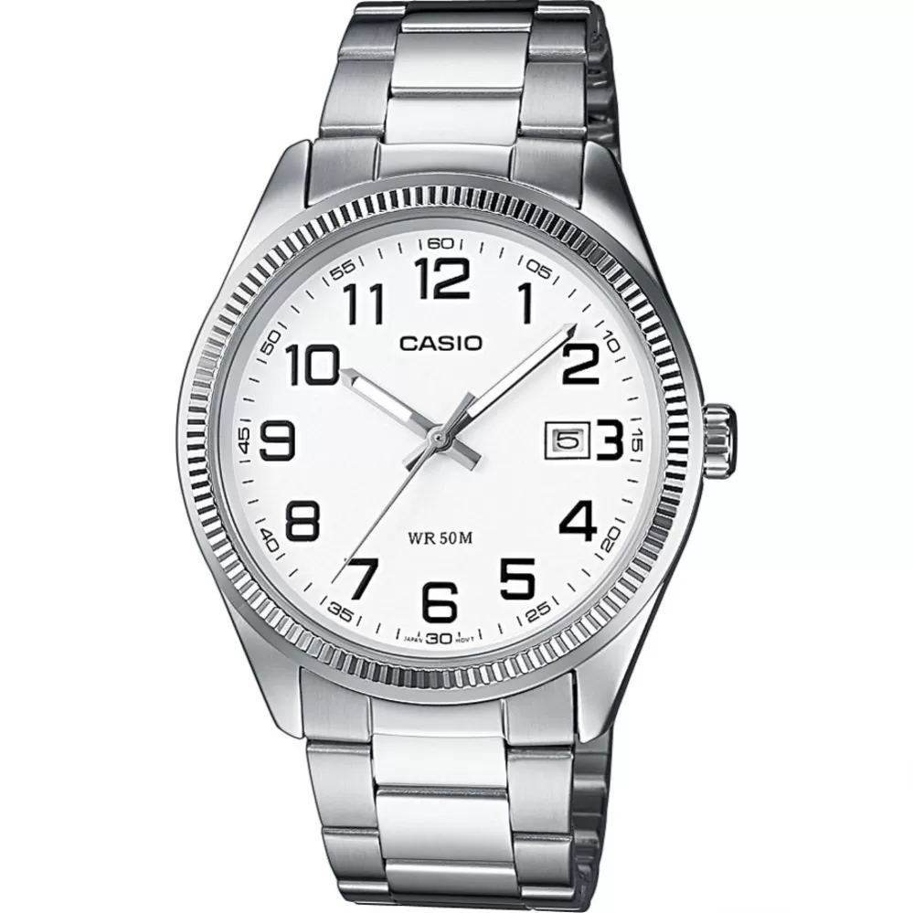 Jednoduché pánske hodinky Casio MTP-1302PD-7BVEF z kolekcie Collection. Hodinky majú mosadzné puzdro v striebornej farbe v kombinácii s oceľovým remienkom a bielym ciferníkom. Hodinky disponujú ukazovateľom dátumu.