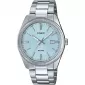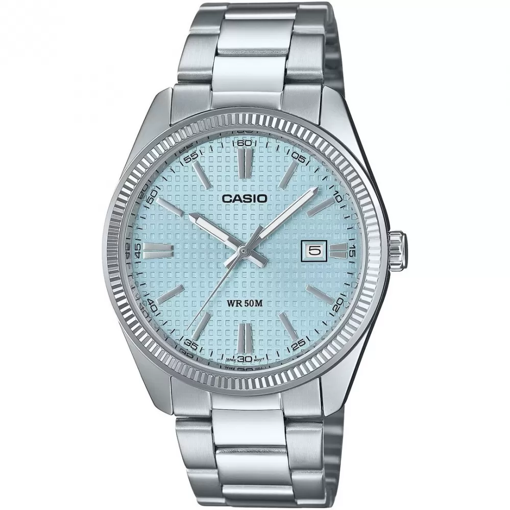 Jednoduché pánske hodinky Casio MTP-1302PE-2AVEF z kolekcie Collection. Hodinky majú mosadzné puzdro v striebornej farbe v kombinácii s oceľovým remienkom a modrým ciferníkom.