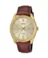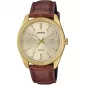 Jednoduché pánske hodinky Casio MTP-1302PGL-9AVEF z kolekcie Collection. Hodinky majú mosadzné puzdro v zlatej farbe v kombinácii s hnedým koženým remienkom a zlatým ciferníkom. Hodinky disponujú ukazovateľom dátumu.