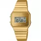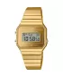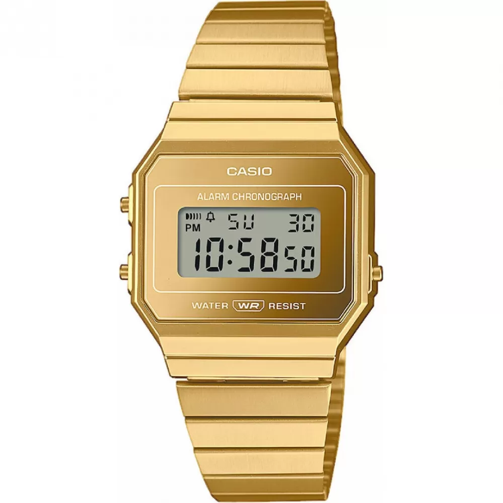 Unisex digitálne hodinky A700WEVG-9AEF z kolekcie CASIO Vintage. Hodinky v retro štýle s plastovým puzdrom a oceľovým remienkom. Vodotesnosť týchto hodiniek je pod označením 30M, teda použitie je vhodné iba pri umývaní rúk alebo ľahkom daždi.