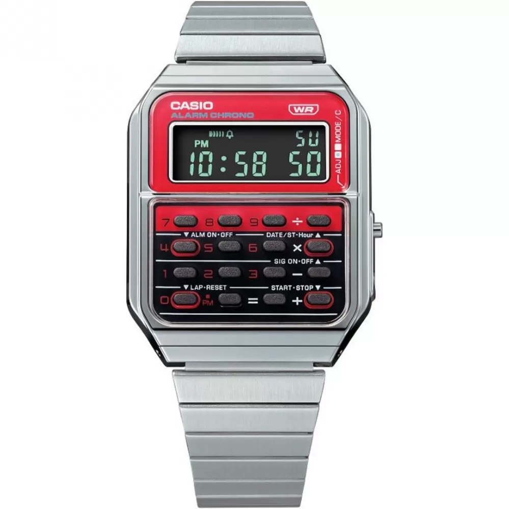 Hodinky Casio CA-500WE-4BEF s kalkulačkou, obľúbené od svojho vydania v 80. rokoch, dostávajú vysoko kvalitný oceľový remienok. Rovnaké originálne funkcie kalkulačky sú spojené s pozdĺžnym puzdrom a oceľovým remienkom pre dokonalý retro štýl. Jedinečný ciferník kombinuje digitálne zobrazenie času spoločne v kombinácii s kalkulačkou.