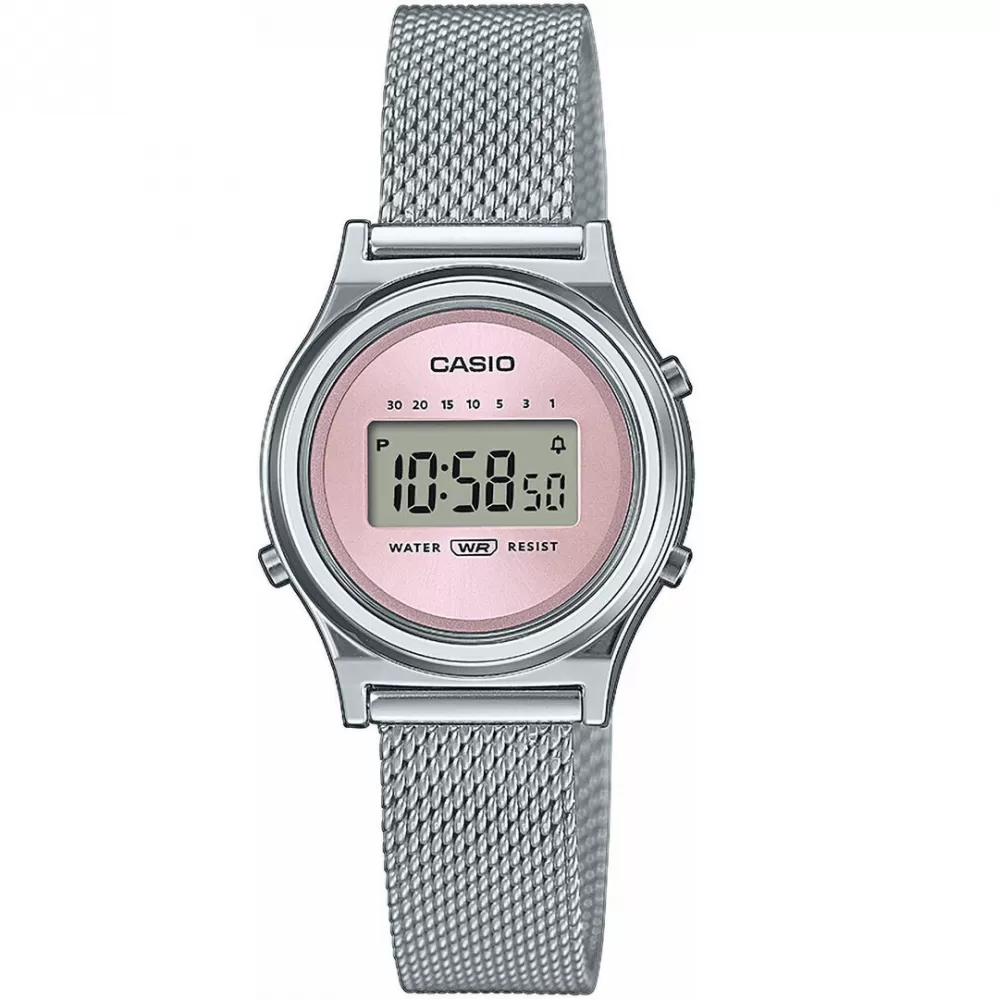 Dámske digitálne hodinky LA700WEM-4AEF z kolekcie CASIO Vintage. Hodinky v retro štýle s plastovým puzdrom a oceľovým remienkom milánskeho typu. Vodotesnosť týchto hodiniek je pod označením 30M, teda použitie je vhodné iba pri umývaní rúk alebo ľahkom daždi.