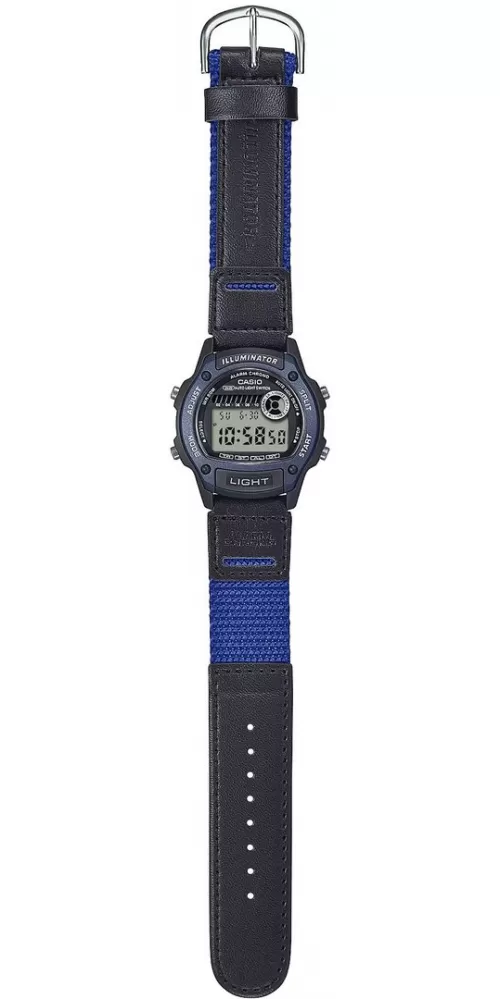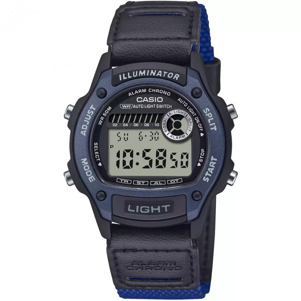 Unisex náramkové hodinky Napájanie z batérie Pohyb 3549 Priemer púzdra 43,0 mm Puzdro v tvare kruhu Plastové puzdro ČIERNA farba puzdra Kombinovaný ťahák koža-látka Modrá farba ťahu Digitálny ciferník Ciferník s arabskými číslicami Materiál skla - plast Vodeodolný pri sprchovaní a umývaní Dátum Stopky Odpočítavacie stopky s opakovaním Automatické podsvietenie LED displeja Budík Druhýkrát
