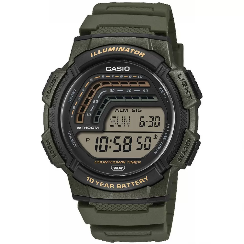 Pánske náramkové hodinky Napájanie z batérie Pohyb 3583 Priemer púzdra 45,0 mm Puzdro v tvare kruhu Plastové puzdro Zelená farba puzdra Plastový zdvih Zelená farba ťahu Digitálny ciferník Ciferník s arabskými číslicami Materiál skla - plast Vodeodolný pri plávaní Dátum Stopky Odpočítavacie stopky s opakovaním LED podsvietenie displeja Budík Svetové časy