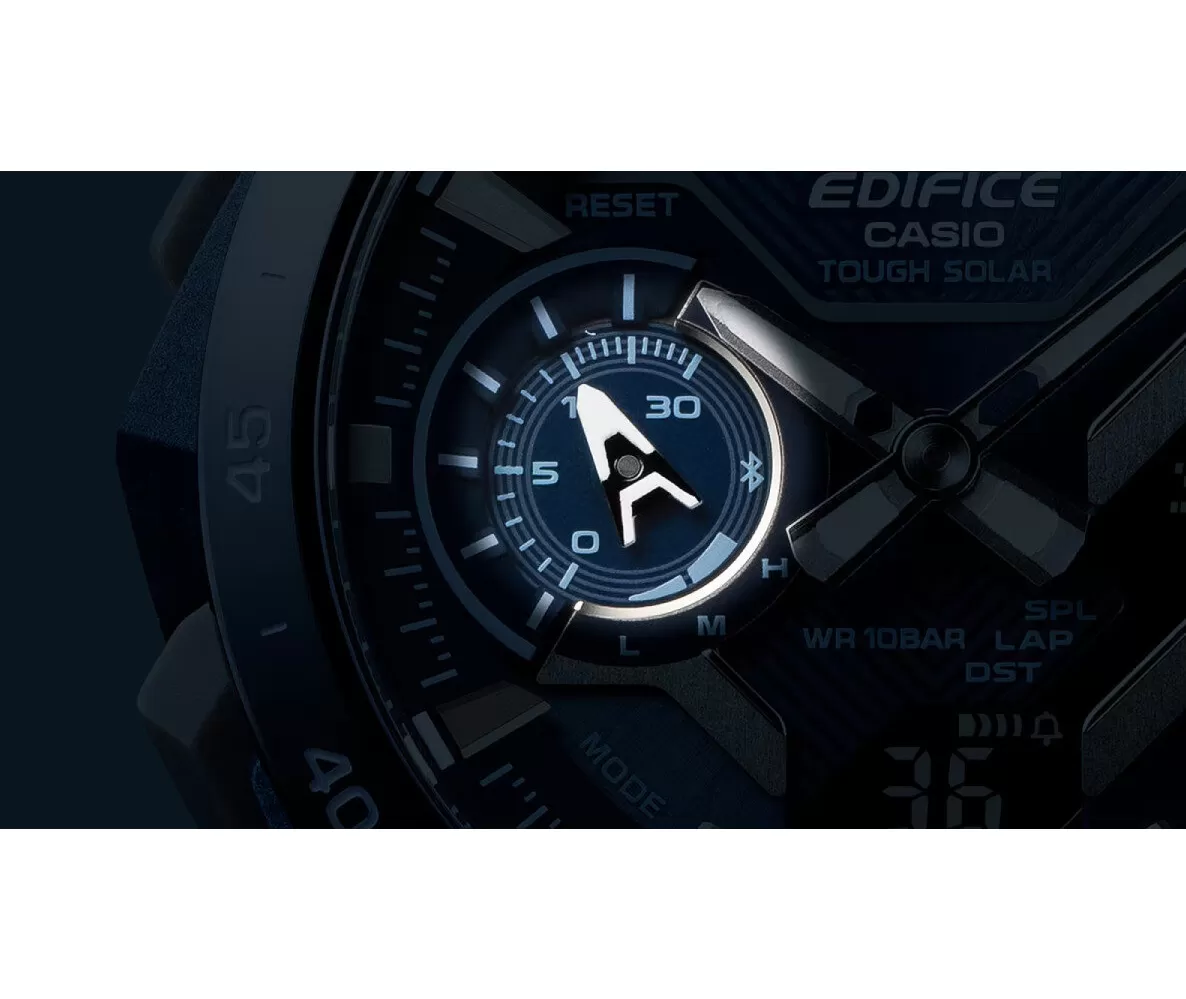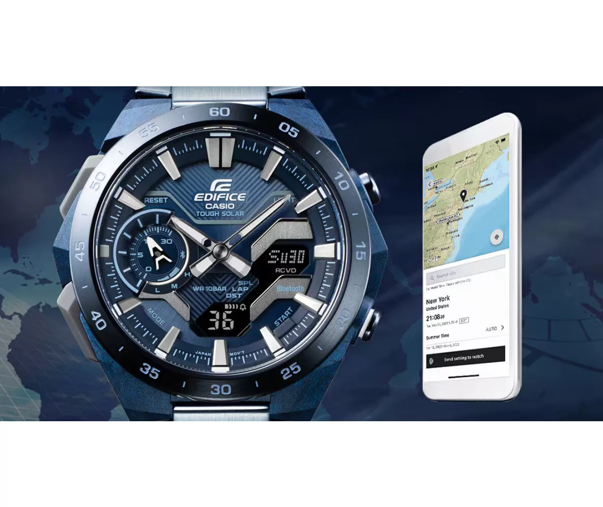 Casio EDIFICE ECB 2200CB-2A pritiahne ich dynamický vzhľad a sofistikovaný číselník. Model zdôrazňuje dobrú prehľadnosť a ľahkú manévrovateľnosť, pretože možnosť úplného využitia všetkých funkcií, ktoré ponúka. Najdôležitejšou vecou je nepochybne možnosť synchronizácie hodiniek pomocou smartfónu prostredníctvom technológie Bluetooth . Pripojenie, v spojení s použitím príslušnej aplikácie (hodinky Casio), vám umožňuje ovládať aktuálny a presný čas, ponúka možnosť ľahko upraviť dvojitý čas výberom jedného z preddefinovaných 300 miest, ktoré sa dajú ľahko zaznamenávať aktuálne umiestnenie s časom navštívením mapy. Medzi ďalšie užitočné funkcie patrí vyhľadávač telefónu - Keď stlačíte tlačidlo Watch, váš telefón znie a nájdete to jednoduchšie.