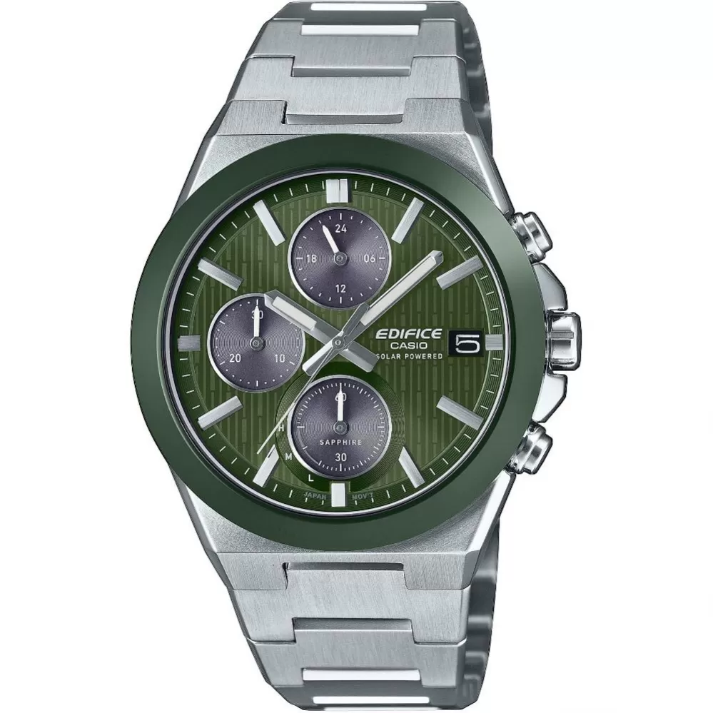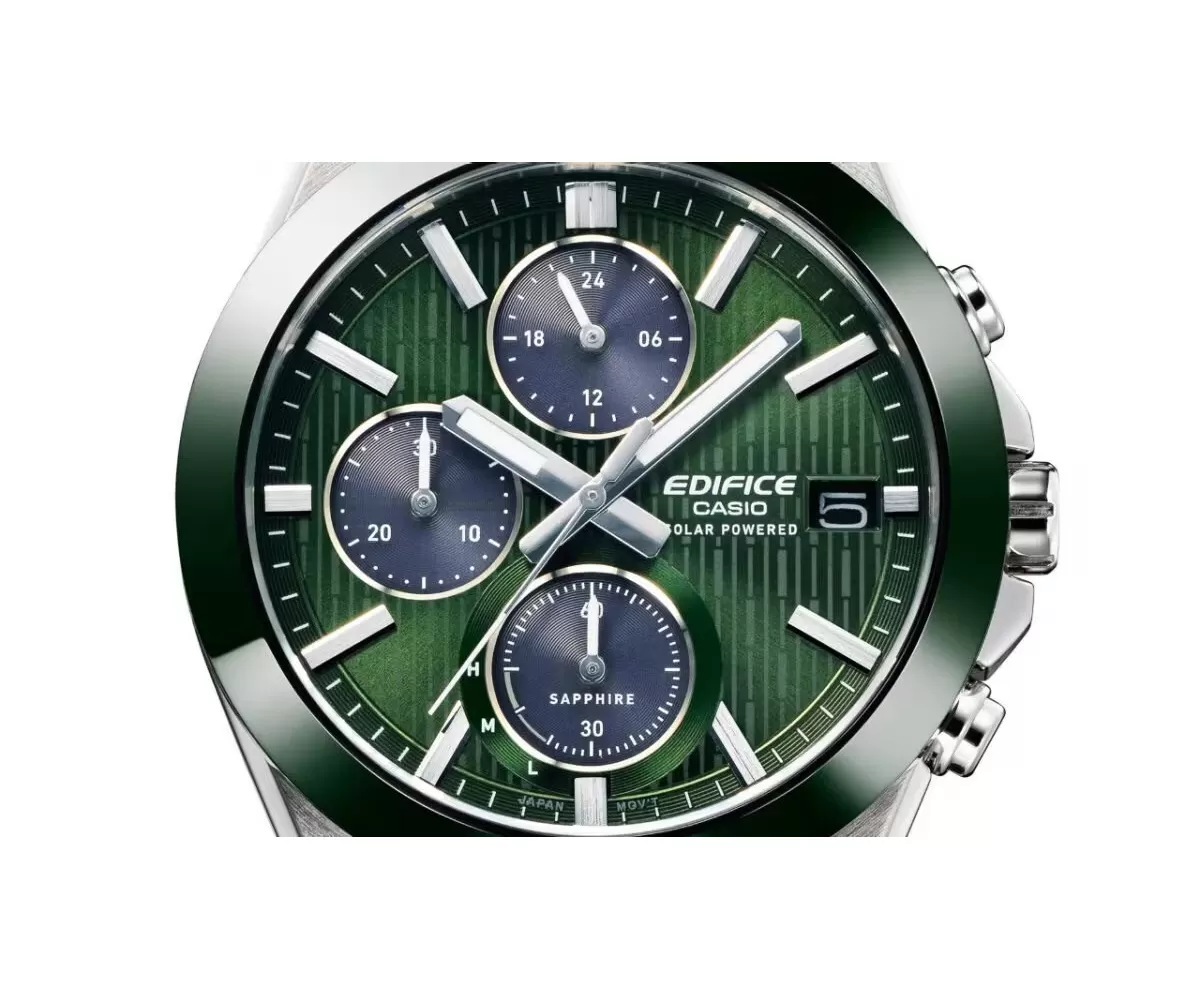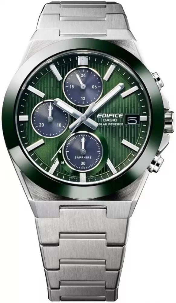 Pánske náramkové hodinky Solárne napájanie Pohyb 5529 Priemer púzdra 40,9 mm Puzdro v tvare kruhu Oceľové puzdro Strieborná farba puzdra Oceľový zdvih Strieborná farba ťahu Ručný ciferník Zelená farba ciferníka Ciferník s dvanástimi indexmi Materiál skla - zafírové sklo Vodeodolný pri plávaní Dátum Stopky