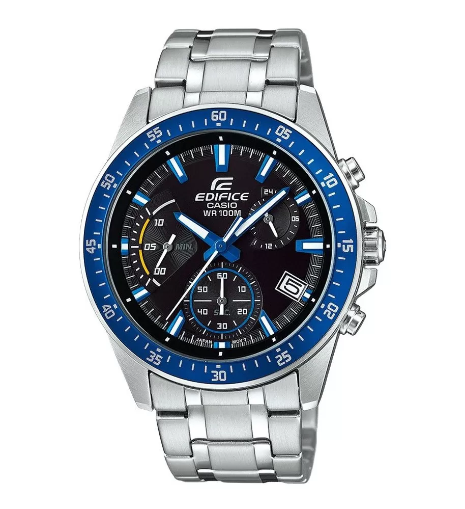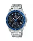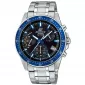 Krásne hodinky značky Casio v celo-oceľovom prevedení z modelového radu Edifice. Hodinky sú vyrobené v kombinácii oceľovej, modrej a čiernej farby. Puzdro a remienok hodiniek sú povrchovo upravené do lesklej a matnej povrchovej úpravy. Čierny ciferník je zdobený modrými prvkami, ktoré krásne ladia s modrou lunetou. Ručičky a indexy hodiniek sú luminiscenčné, takže čas uvidíte aj pri zníženej viditeľnosti. Hodinky disponujú funkciou stopiek, ciferníkom s 24 hodinovým formátom času a ukazovateľom dátumu. Hodinky sa hodia ako na bežný deň tak do spoločnosti aj športovania.