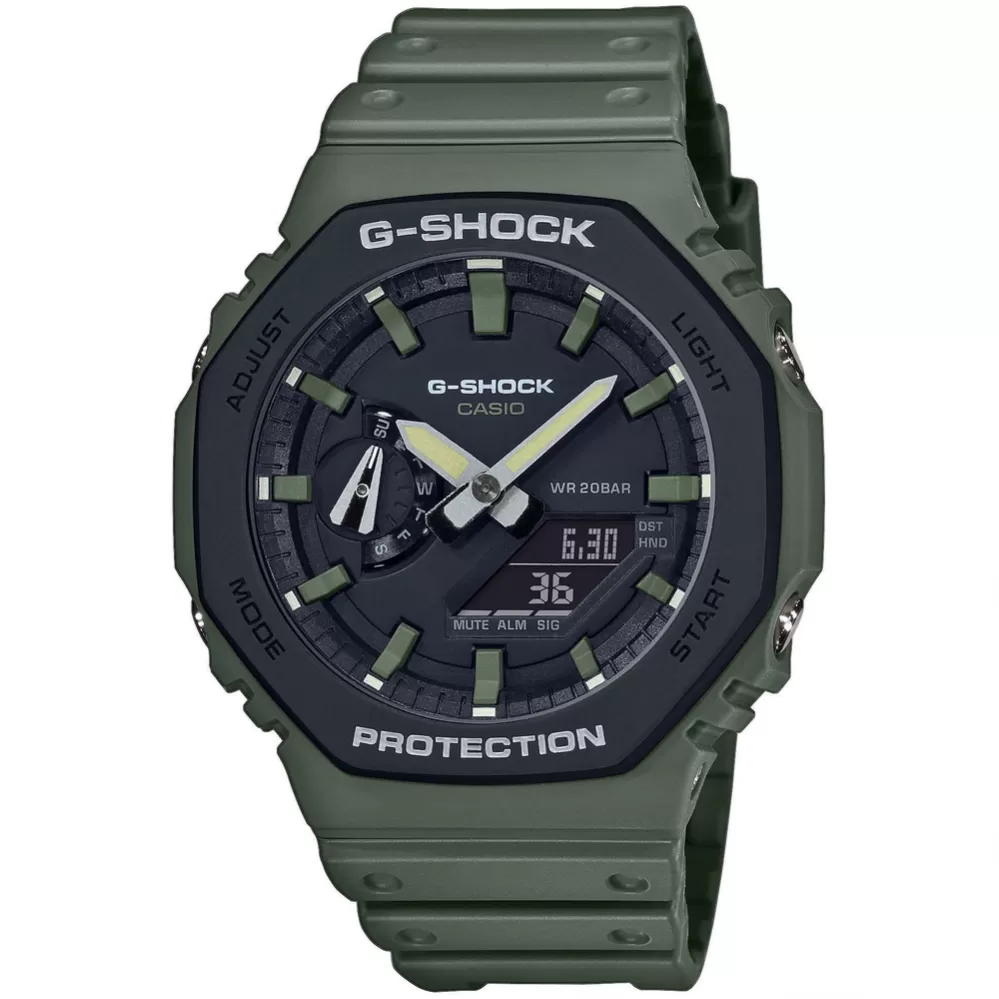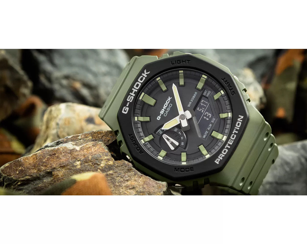 Osemhranná luneta, konštrukcia Carbon Core Guard a športový vzhľad. Hodinky patria k najtenším G-Shockom, puzdro je vysoké iba 11,8 mm. Puzdro nie je príliš masívne, a preto budú hodinky vhodné aj pre mužov s užším zápästím. Z hľadiska funkcií sa jedná o klasiku - teda vodeodolnosť 200m, odolnosť proti nárazom a otrasom, alarm, stopky, automatický kalendár. Navyše tu využijete odpočítavacie stopky, 2 LED diódy, možnosť zapnutia aj vypnutia zvukov. Ďalším bonusom je systém uchytenia remienka Quick Release, ktorý zaistí rýchlu a jednoduchú výmenu remienka.