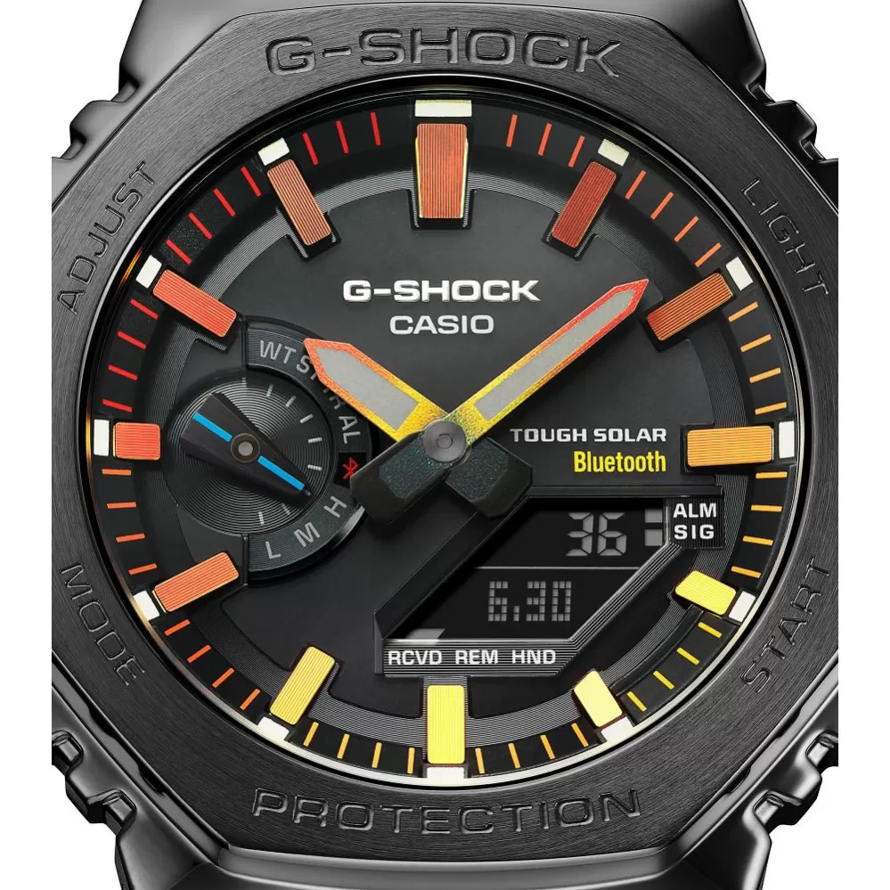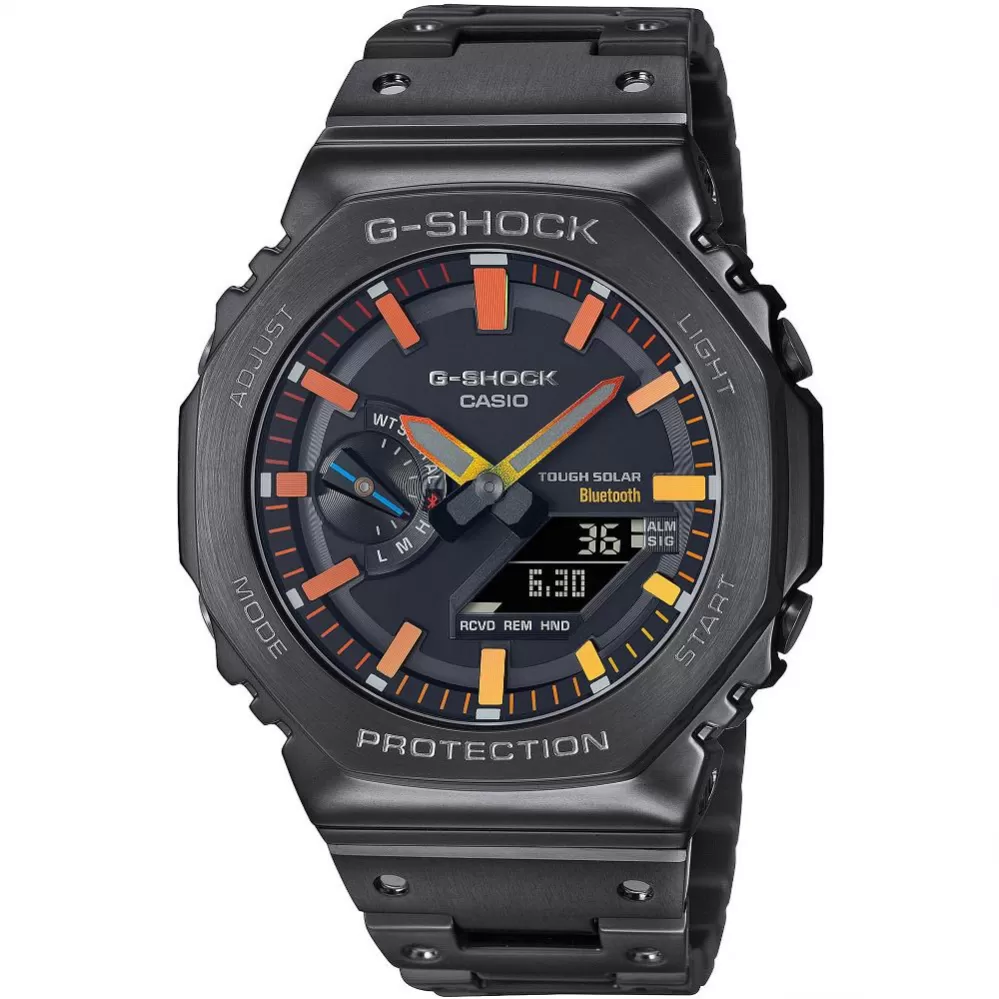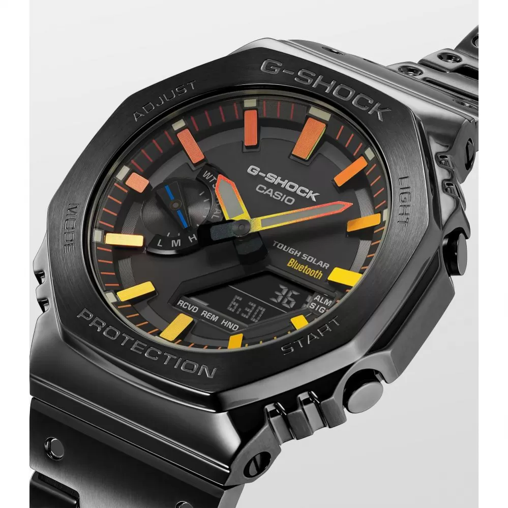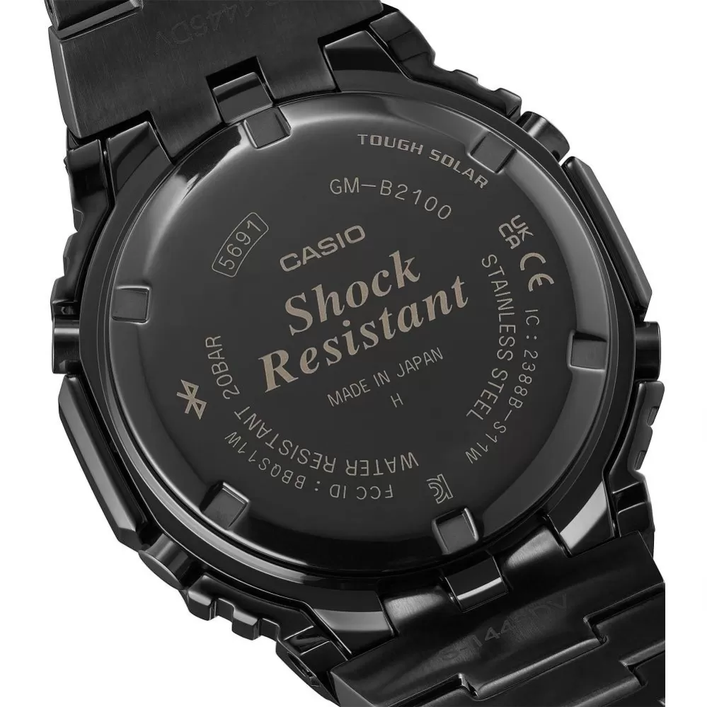 Športový model hodiniek G-Shock GM-B2100BPC-1AER s obľúbeným dizajnom v osembokom púzdre použitom už na legendárnom modeli Casio G-Shock DW 5000C, teraz vo vylepšenom celooceľovom prevedení, so solárne a solárne možnosťou prepojenia s mobilným telefónom cez Bluetooth. Séria G-Shock ponúka už 40 rokov odolné hodinky s veľkým množstvom funkcií v účelnom a nadčasovom prevedení.