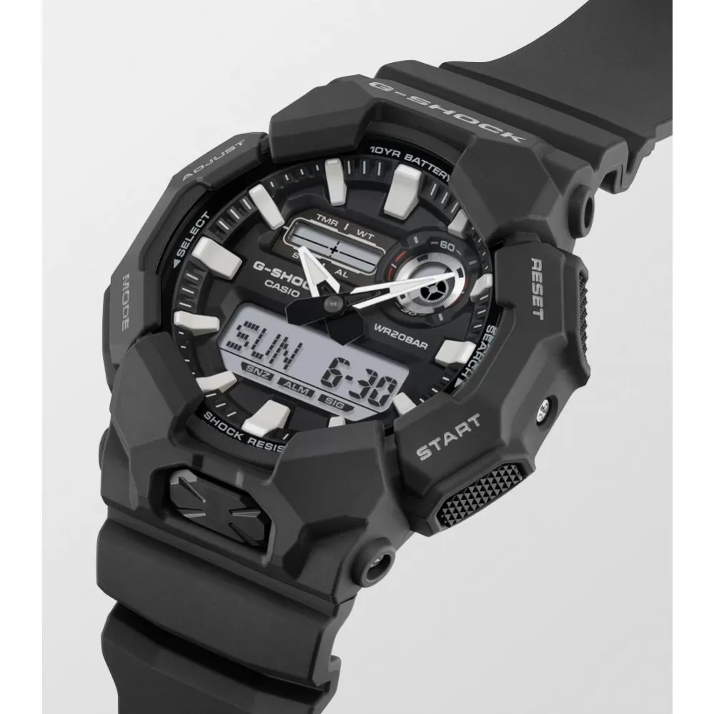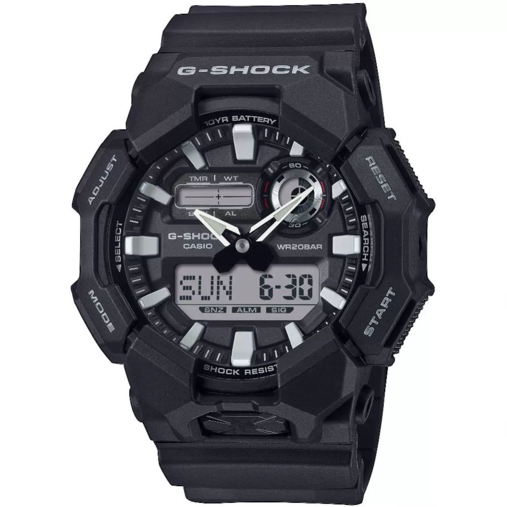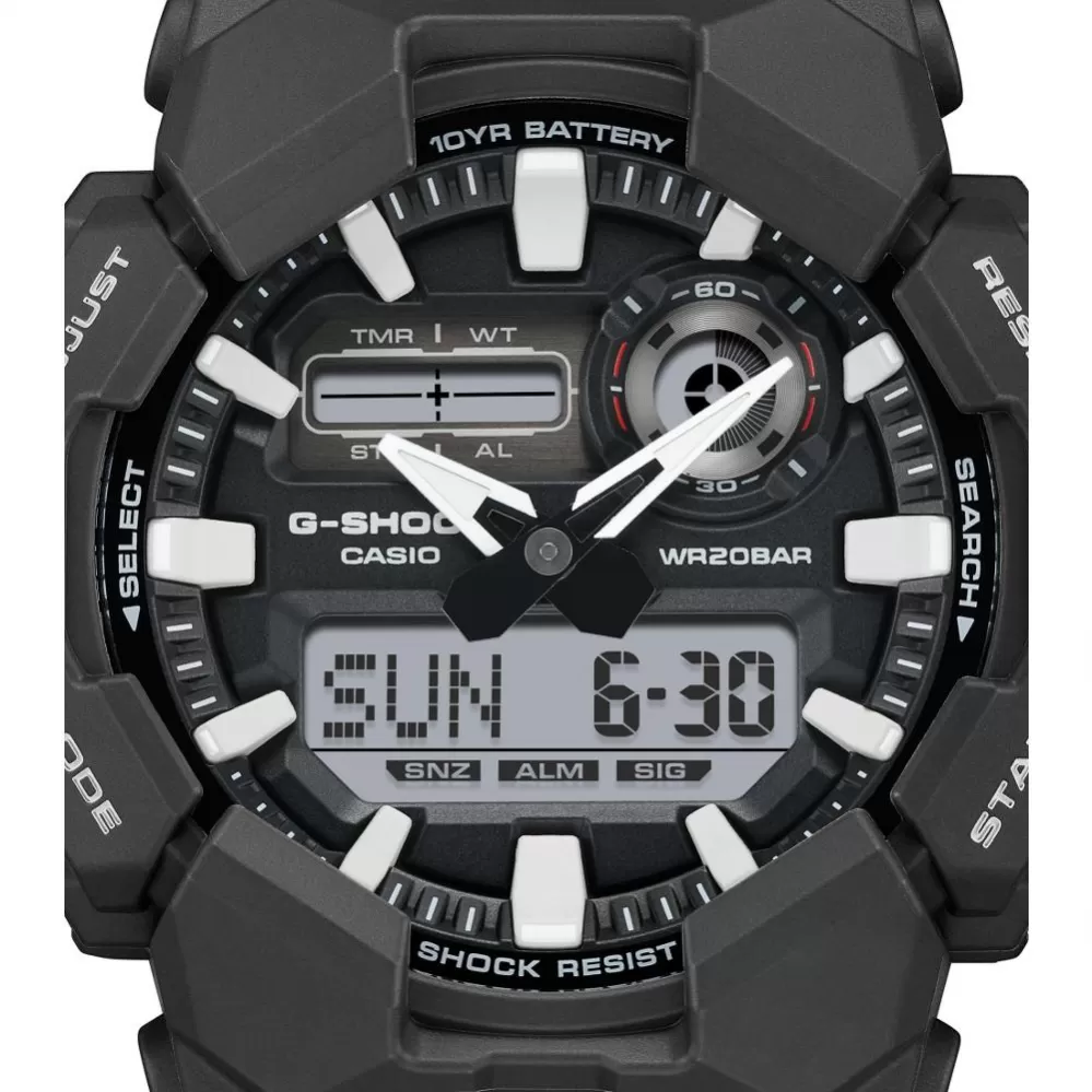 Casio G-Shock GA-010 s kombinovaným číselníkmi prináša všetky praktické funkcie zastrešené vysokou odolnosťou pekne pohromade. Hodinkám nechýba svetový čas, stopky, odpočet, ale napríklad aj automatické LED osvetlenie, ktoré je možné ľahko aktivujete stlačením veľkého tlačidla v spodnej časti puzdra. O odolnosť sa stará konštrukcia Carbon Core Guard. Puzdro zo živice je vystužené a spevnené uhlíkovými vláknami.