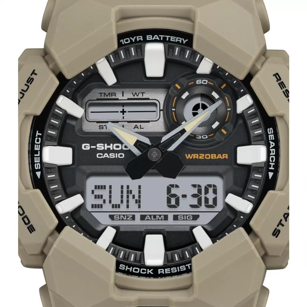 Casio G-Shock GA-010-5AER s kombinovaným číselníkmi prináša všetky praktické funkcie zastrešené vysokou odolnosťou pekne pohromade. ľahko aktivujete stlačením veľkého tlačidla v spodnej časti puzdra. živica je vystužené a spevnené uhlíkovými vláknami.
