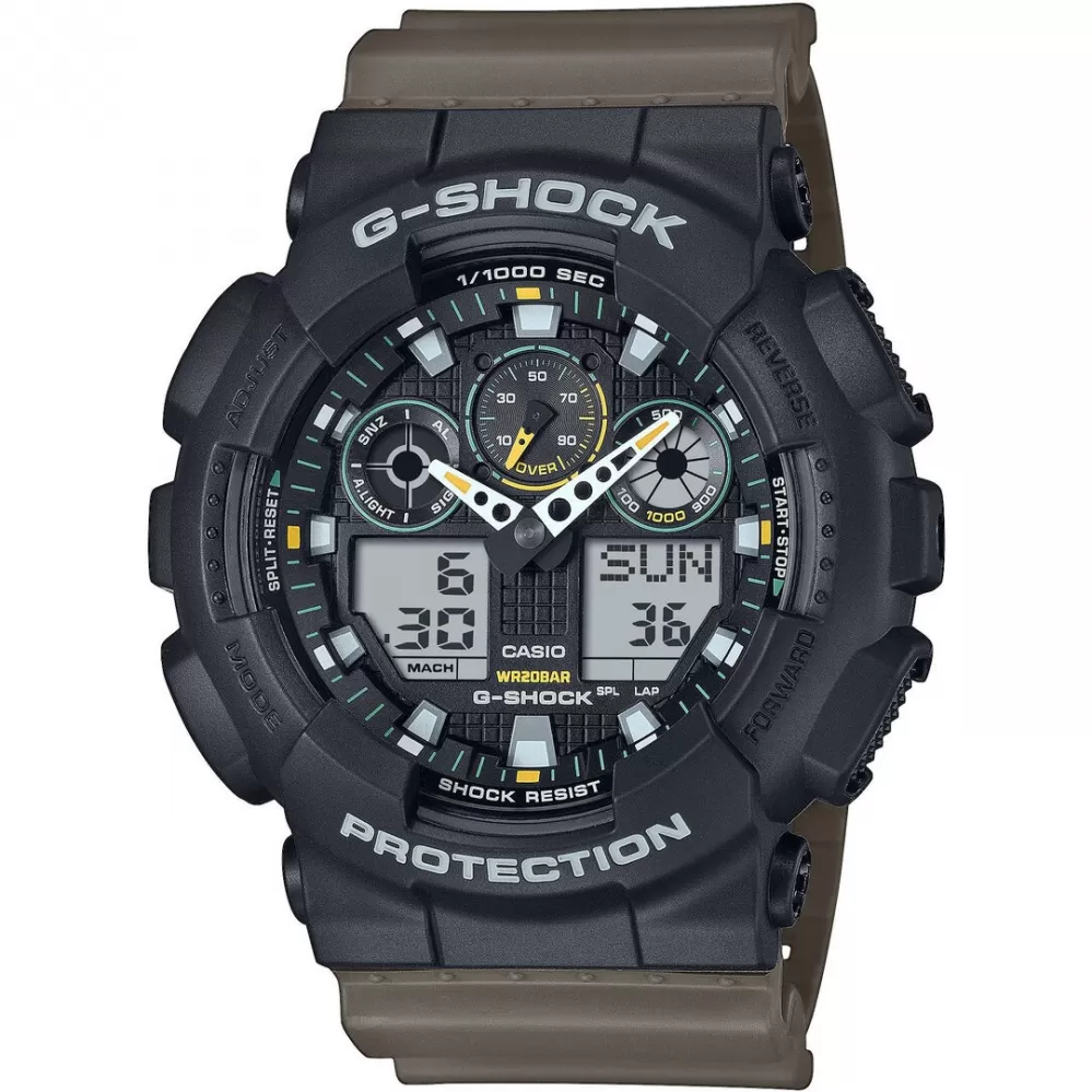 Pánske kombinované hodinky Casio GA-100TU-1A3ER z kolekcie G-SHOCK v čierno-zelenej kombinácii. Hodinky sa Vám budú hodiť ku každému športovému outfitu. Hodinky majú živicový remienok a disponujú množstvom funkcií! Jedná sa o automatické LED osvetlenie, 200m vodotesnosť, stopky s presnosťou 1/1000 sekundy, budík či svetové časy.