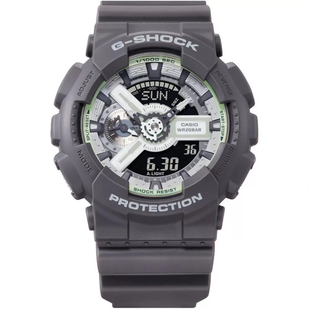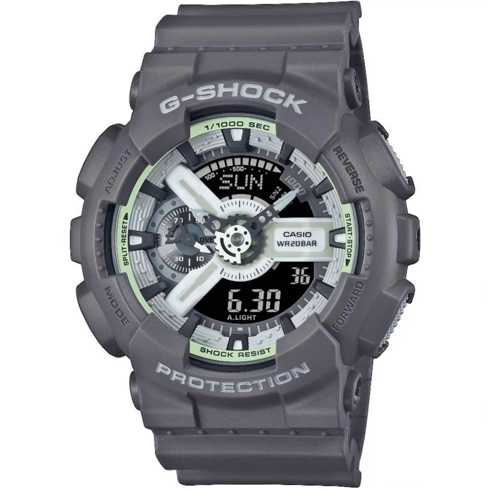 Robustné kombinované hodinky Casio GA-110HD-8AER z kolekcie G-SHOCK v šedom prevedení. Hodinky majú živicový remienok v šedej farbe a disponujú radom funkcií! Jedná sa o LED osvetlenie, 200m vodotesnosť, stopky s presnosťou 1/1000 sekundy, budík či svetové časy.