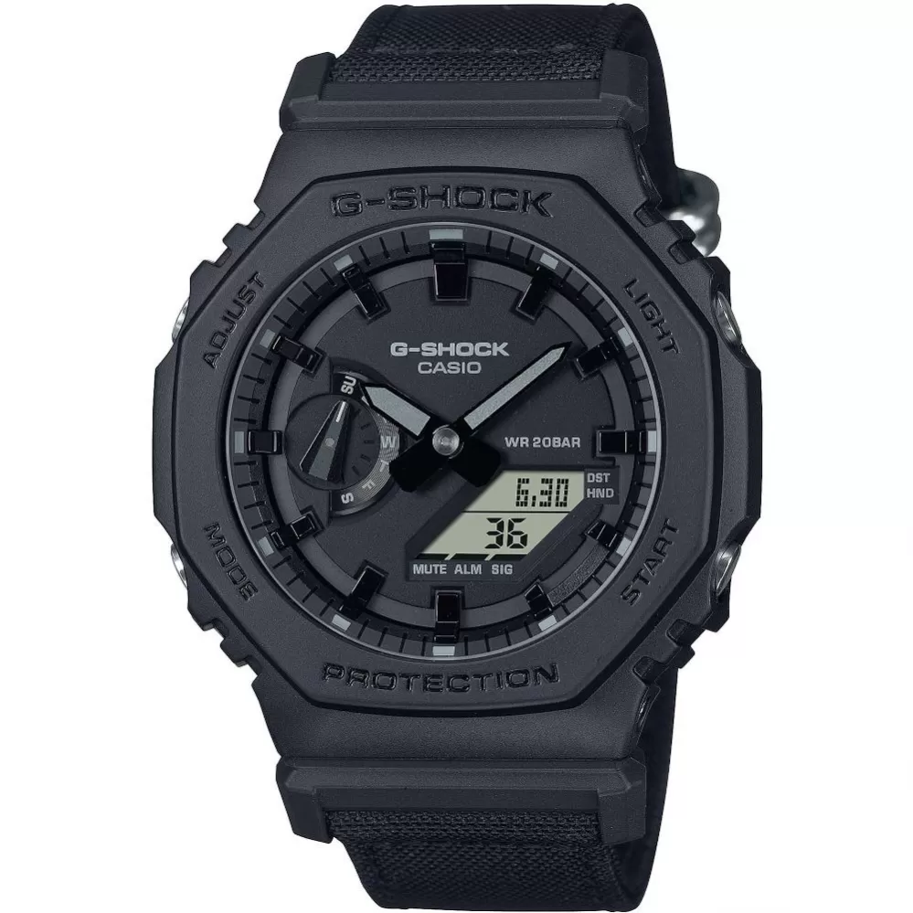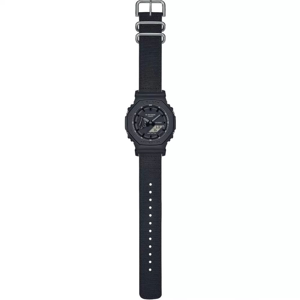 Casio G-Shock GA-2100BCE-1AER s konštrukciou Carbon Core Guard patrí do populárneho radu GA-2100, pre ktorý je charakteristické osemhranné puzdro. Teraz s textilným remienkom.