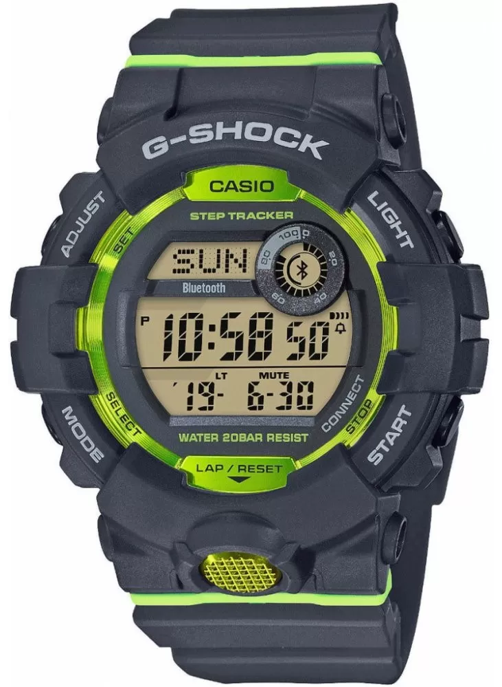 Casio G-Shock G-SquadGBD-800-8ER sú prehľadné, ľahko ovládateľné a vysoko odolné. Majú digitálny číselník zobrazujúci dátum, deň v týždni, stopky, budík a mnoho ďalších funkcií. Novinkou je zabudovaný krokomer. Puzdro hodiniek, vrátane remienka, je gumené. Číselník chráni minerálne sklíčko. Lepšia čitateľnosť zaisťuje LED osvetlenie displeja. Vodotesnosť tohto modelu je 200M, s hodinkami teda môžete bez problémov plávať, či sa dokonca potápať.