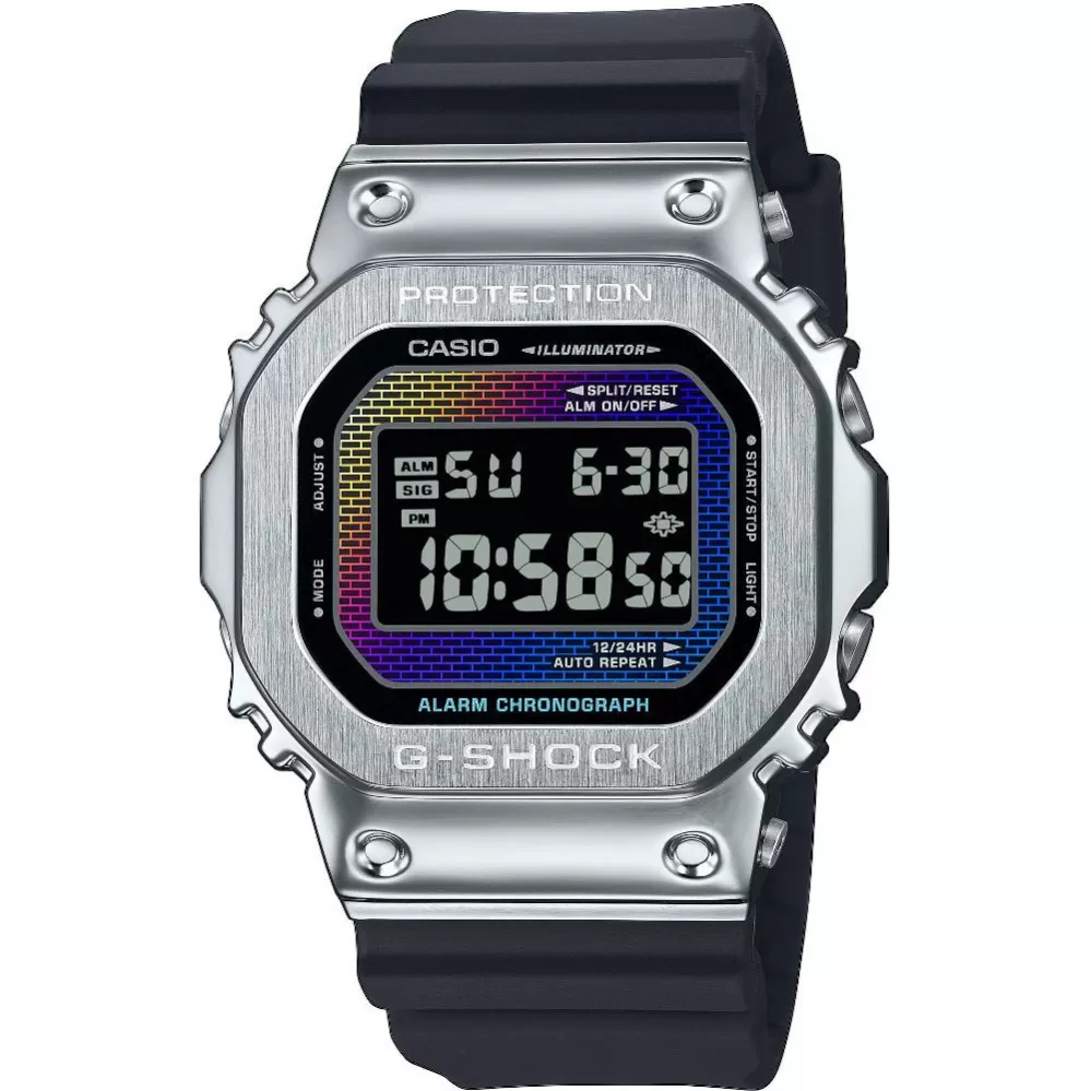 Casio G-Shock GM-5600RW-1ER Rainbow Brick Wall Series nadväzujú na tradíciu a osvedčené tvary, ktoré sú medzi nami už 40 rokov a rozširujú ponuku modelov s oceľovým puzdrom. Model preberá obľúbené hranaté puzdro hodiniek Casio G-Shock DW 5000 z roku 1983.