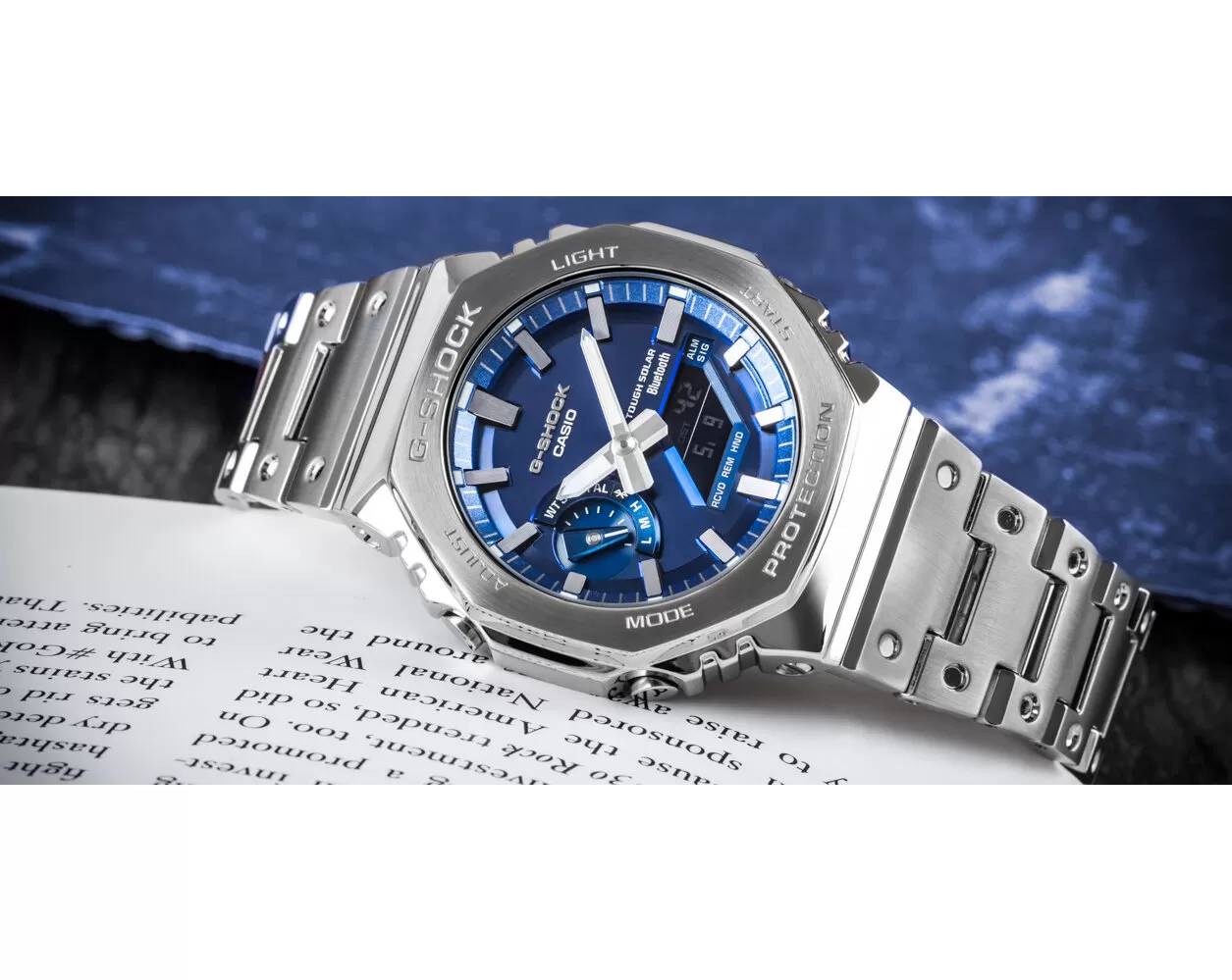Pánske náramkové hodinky Solárne napájanie Hnutie 5691 Priemer púzdra 44,4 mm Puzdro v tvare osemuholníka Oceľové puzdro Strieborná farba puzdra Oceľový zdvih Strieborná farba ťahu Kombinovaný ciferník Modrá farba ciferníka Ciferník s dvanástimi indexmi Materiál skla - minerálne sklo Odolné voči vode pri potápaní bez prísunu kyslíka Dátum Stopky Odpočítavacie stopky LED podsvietenie displeja 5 budíkov Svetové časy Ďalšie funkcie BLUETOOTH