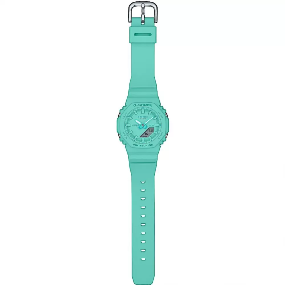 Casio G-Shock GMA P2100-2A sa obliekli do populárnej tyrkysovej farby. Patrí do trojice modelov v monochromatickom prevedení. Zvyšné dva modely sa obeli do ružovej a bielej. Puzdro, remienok a dokonca aj jednotlivé súčasti číselníka sú prevedené v jemne odlišných odtieňoch rovnakej farby.