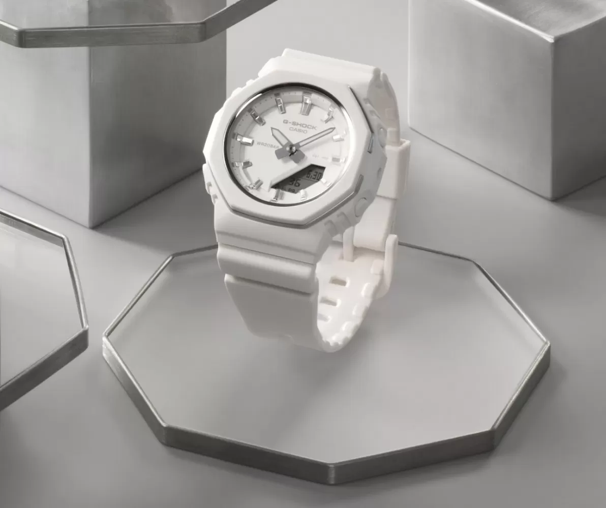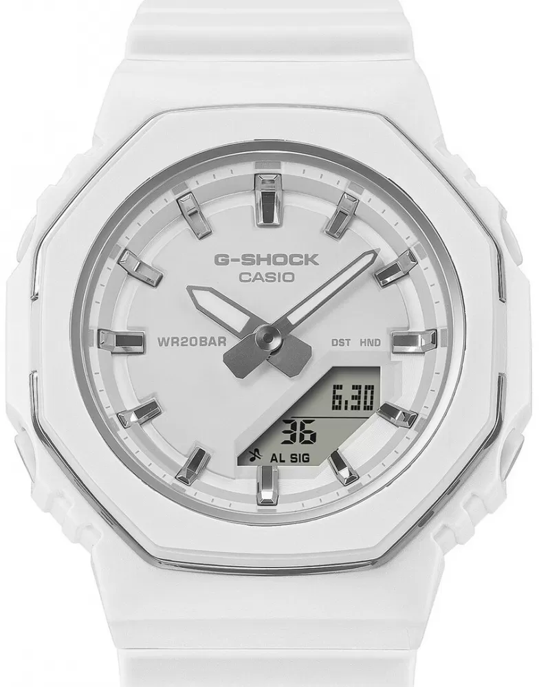 Unisex náramkové hodinky Napájanie z batérie Pohyb 5730 Priemer púzdra 40,2 mm Puzdro v tvare osemuholníka Plastové puzdro Biela farba puzdra Plastový zdvih Biela farba ťahu Kombinovaný ciferník Strieborná farba ciferníka Ciferník s dvanástimi indexmi Materiál skla - minerálne sklo Odolné voči vode pri potápaní bez prísunu kyslíka Dátum Stopky Odpočítavacie stopky LED podsvietenie displeja 5 budíkov Svetové časy