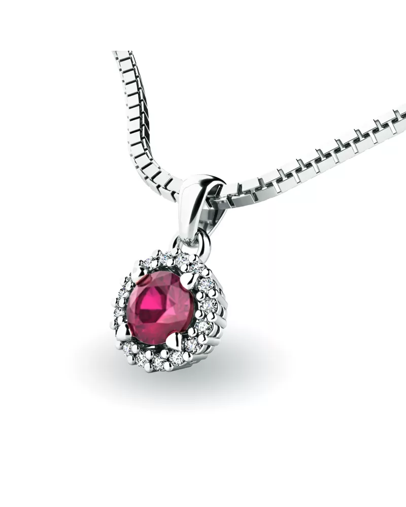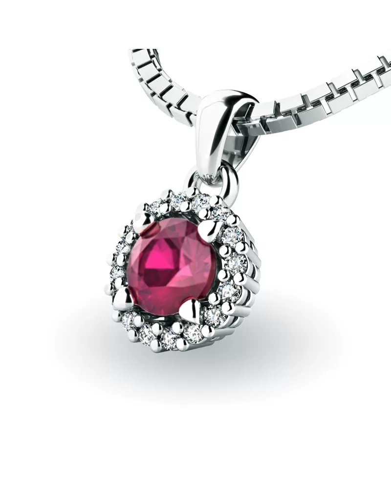 Nádherný přívěsek zdobený větším středovým rubínem a menšími diamanty určitě potěší každou ženu. Přívěsek je vyrobený z bílého čtrnáctikarátového zlata - 585/1000 v lesklé povrchové úpravě. Vsazené diamanty jsou vybroušeny dokonalým briliantovým brusem, díky kterému dokonale odráží světlo a jejich brilance neuvěřitelné září z každého úhlu pohledu! Všechny kameny jsou pevně uchyceny krapnami. Vsazování diamantů a drahých kamenů provádějí naši nejzkušenější mistři zlatníci ručně pod mikroskopem s přesností na 0,01mm a proto nehrozí vypadnutí kamínků jako to bývá u strojně vyráběných náušnic. Celé náušnice působí dokonalým a luxusním dojmem!