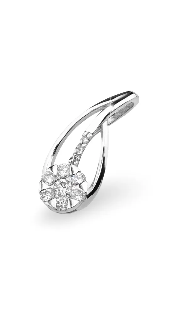 Krásny prívesok je vyrobený z bieleho štrnásťkarátového zlata rýdzosti 585/1000 v lesklej povrchovej úprave a je osadený dvanástimi diamantmi briliantového brusu, ktorý zaisťuje maximálnu brilanciu vybrúsených facet, dokonale odráža svetlo a neuveriteľne žiari! Diamanty sú po celom prívesku a prívesok vyzerá jemne a elegantne! Prívesok je dokonale spracovaný do najmenších detailov a bude tak ideálnym darčekom, ktorý zaručene poteší každú ženu či dievča.