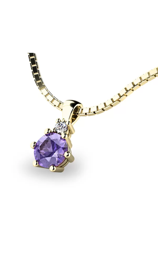 Tento krásny prívesok je vyrobený zo žltého štrnástich karátového zlata s rýdzosťou 585/1000 s lesklou povrchovou úpravou. Prívesok je vysadený jedným veľkým tanzanitom v krásnej fialovej farbe a jedným menším diamantom. Oba kamene sú brúsené do briliantového brusu, ktorý zaručuje maximálny lesk a brilanciu kameňov.