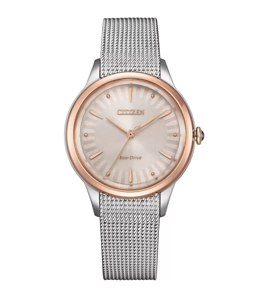 Tieto dámske hodinky sú poháňané ekologickým pohonom, ktorý využíva svetlo ako zdroj energie. Kryt je vyrobený z nehrdzavejúcej ocele s priemerom približne 32 mm. Diama má perlový odtieň v hnedej farbe a je doplnený jednoduchými funkciami a bodkami namiesto indexov hodín. Vodotesný model je 50 m, čo znamená, že hodinky vydržia striekajúcu vodu, umývanie rúk alebo dážď, ale nie sú určené na plávanie. Sledujte náramok je v milánskom štýle s jemnou štruktúrou.
