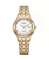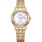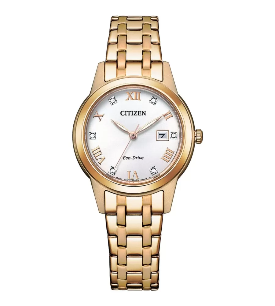 Citizen FE1 elegantné dámske hodinky od značky Citizen, ktoré kombinujú klasický vzhľad s praktickou technológiou Eco-Drive. Hodinky majú menšie okrúhle puzdro s priemerom zhruba 29,4–29,5mm z ušľachtilej ocele s ružovo-zlatou povrchovou úpravou, čo im dodáva jemný a ženský výraz vhodný ako na každodenné nosenie, tak aj do spoločnosti. Biely ciferník analógové ručičky s luminiscenčnou vrstvou pre lepšiu čitateľnosť v slabom svetle a malé okienko s dátumom na pozícii tretej hodiny.