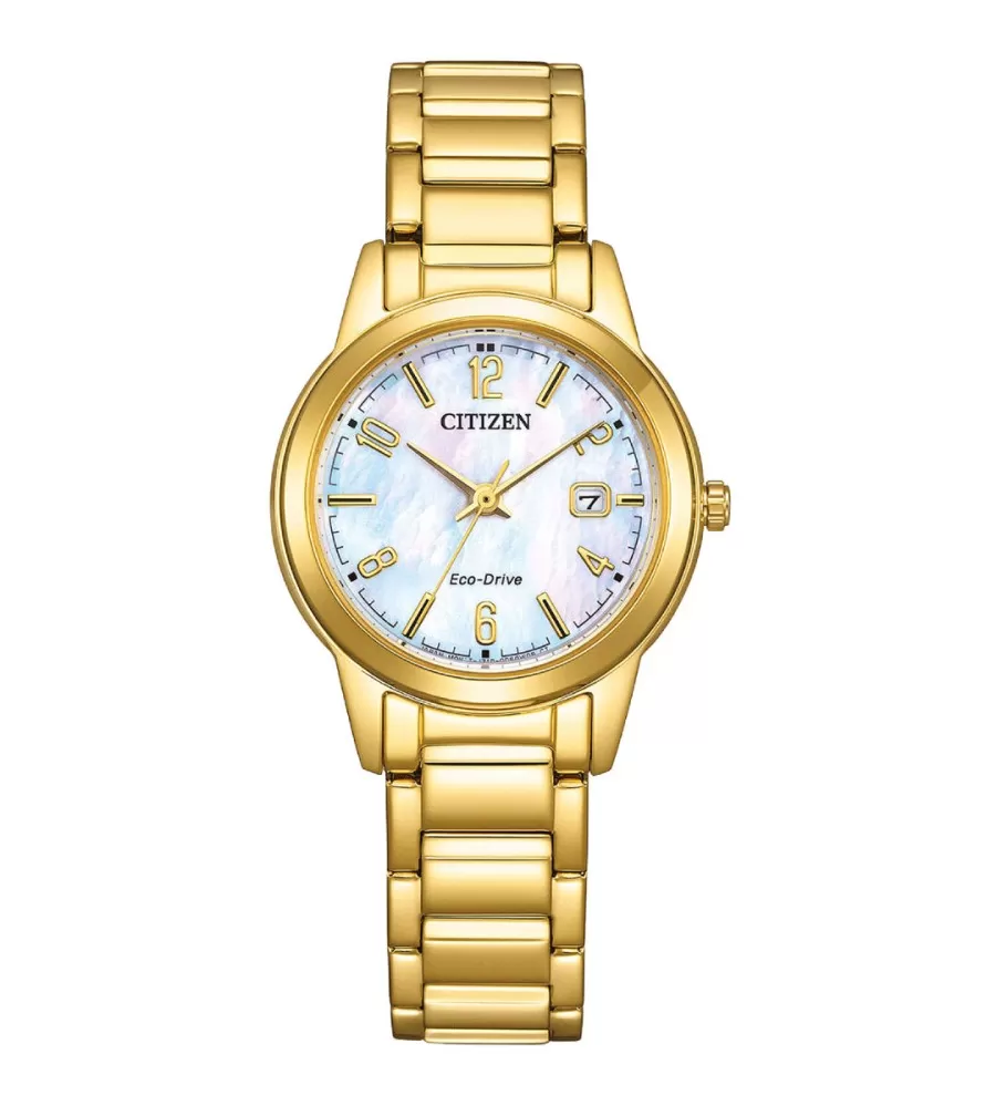 Citizen Ladies FE1242‑78D sú elegantné dámske hodinky značky Citizen, ktoré kombinujú klasický vzhľad s modernou technológiou Eco‑Drive. Hodinky majú puzdro aj náramok z ušľachtilej ocele s lesklou povrchovou úpravou v teplom zlatom odtieni, čo im dáva nadčasovo elegantný a ženský vzhľad vhodný ako na denné nosenie, tak aj do spoločnosti.