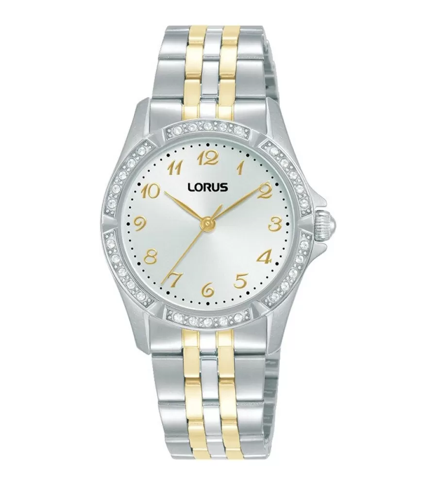 Dámske hodinky Lorus RG249YX9 pôsobia veľmi jemne, elegantne a vyvážene, pričom spájajú šperkový vzhľad s každodennou praktickosťou. Okrúhle puzdro z nerezovej ocele v striebornom prevedení je doplnené lunetou osadenou trblietavými kamienkami, ktoré decentne orámujú ciferník a dodávajú hodinkám luxusný nádych. Svetlý analógový ciferník so zlatými arabskými číslicami a štíhlymi ručičkami zaisťuje dobrú čitateľnosť a elegantný kontrast. Minerálne sklíčko chráni ciferník pri bežnom nosení a spoľahlivý quartzový strojček sa stará o presný chod. Oceľový ťah v dvojfarebnom prevedení plynule nadväzuje na puzdro, pohodlne sa prispôsobí zápästiu a podčiarkuje celkovo ženský a vkusný charakter tohto modelu, pričom vodotesnosť 5 ATM umožňuje bezstarostné používanie pri bežnom kontakte s vodou.