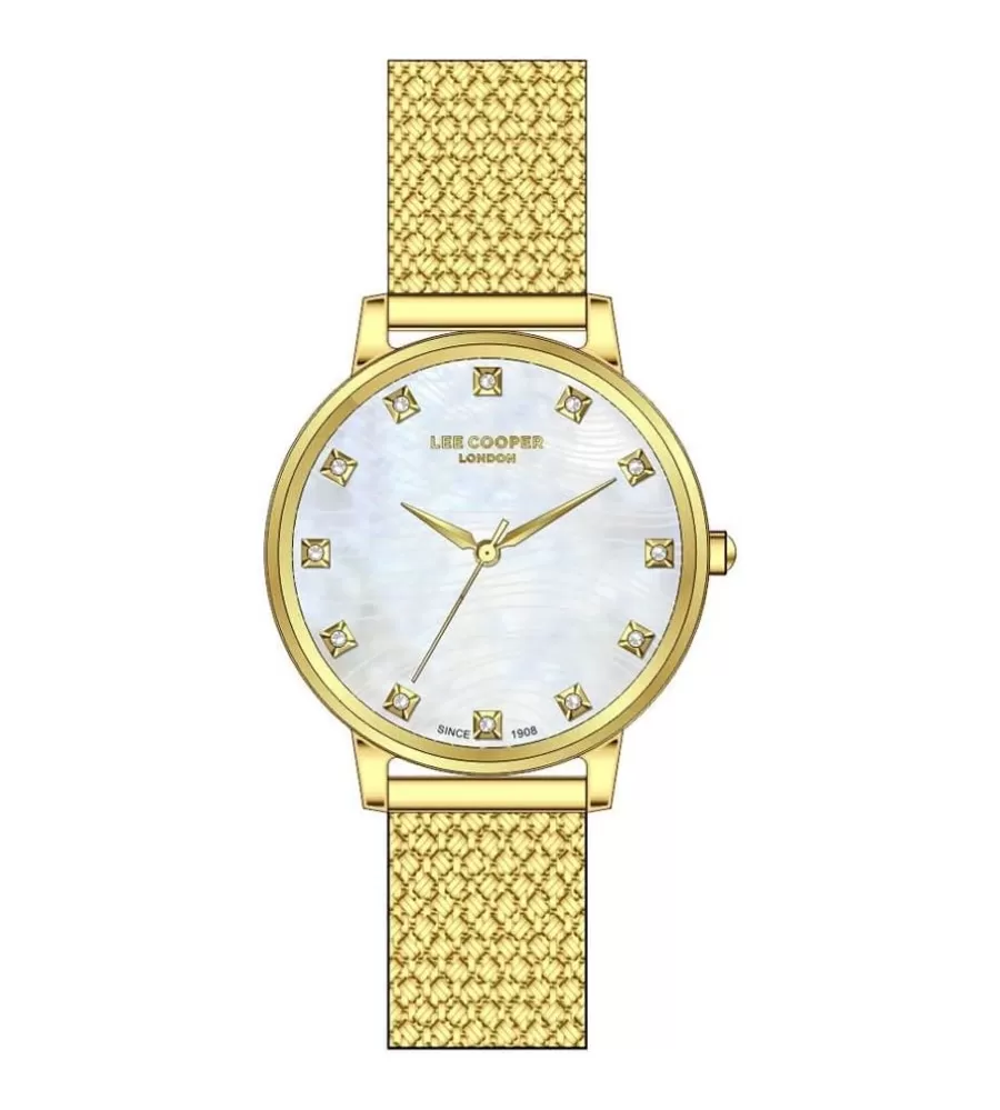Lee Coper LC07401.120 sú elegantné dámske hodinky s okrúhlym puzdrom vyrobeným z oceľovej zliatiny a kovu v zlatom odtieni. Priemer puzdra je približne 36 mm a je poháňaný kremenným pohybom. Vodotesné až 30 m, ktoré je vhodné na každodenné opotrebenie.