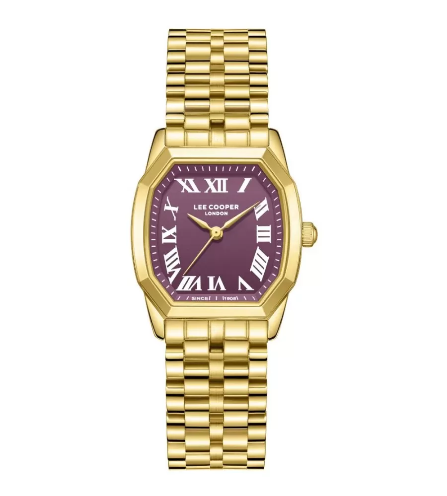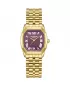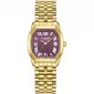 Dámske náramkové hodinky majú batériu a kovové puzdro s osebežnými tvahmi s priemerom 27 mm v elegantnej zlatej farbe, doplnenom zlatým kovovým ťahom. Na fialovom číselníku sú rímske číslice pre ľahké a štýlové čítanie času. Čas je chránený minerálnym sklom a hodinky sú odolné voči vode pri normálnom opotrebení.