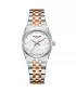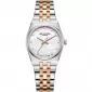 Dámske náramkové hodinky s batériou má okrúhle kovové puzdro s priemerom 30 mm v dizajne striebra, doplnené kovovým ťahom kombinujúcim strieborné a zlaté farby. Dialca má perlový odtieň a je vybavený dvanástimi jednoduchými indexmi, ktoré sú vysadené zirkónmi. Sklo je minerálne a hodinky sú odolné voči vode v normálnom opotrebení.