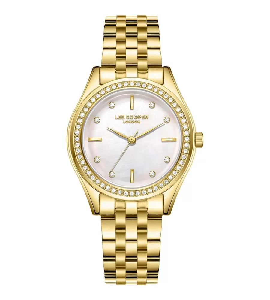 Lee Cooper LC08211.120 má kovové puzdro v zlatej farbe a ladenie kovového náramku. Diama je biela s perlyovým efektom, doplneným zlatými rukami a jemnými indexmi. Hodinky riadi pohyb kremennej batérie a slúži iba na zobrazenie času bez ďalších funkcií. Sú elegantné a vhodné na každodenné nosenie spoločenských udalostí.