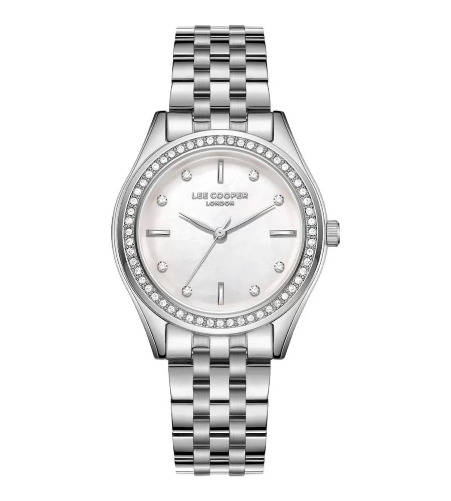 Lee Cooper LC08211.320 má okrúhle kovové puzdro v striebornej farbe a ladenie kovového náramku. Diama je biela s perlyovým efektom, doplneným zlatými rukami a jemnými indexmi. Hodinky riadi pohyb kremennej batérie a slúži iba na zobrazenie času bez ďalších funkcií. Sú elegantné a vhodné na každodenné nosenie spoločenských udalostí.