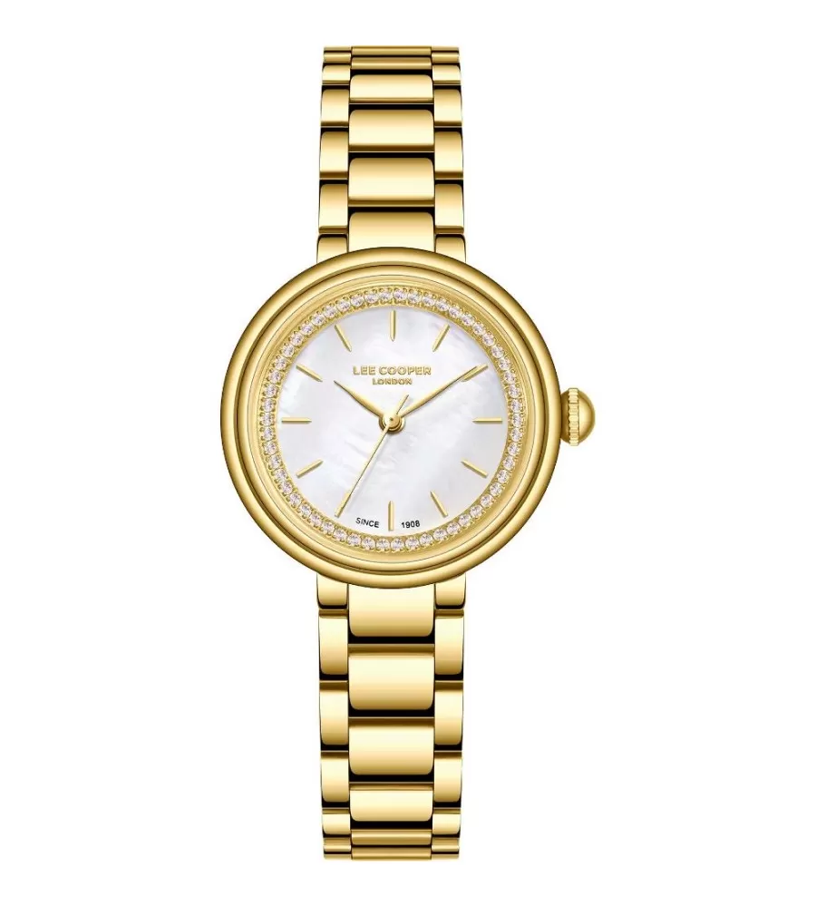 Dámske hodinky Lee Cooper LC08279.120 majú okrúhle kovové puzdro zlatej farby a ladiaci kovový náramok. Ciferník je bielej farby s perleťovým efektom, doplnený zlatými ručičkami a jemnými indexmi. Hodinky sú poháňané batériovým quartz strojčekom a slúžia len na zobrazenie času bez akýchkoľvek ďalších funkcií. Sú elegantné a vhodné na každodenné nosenie na spoločenské udalosti.