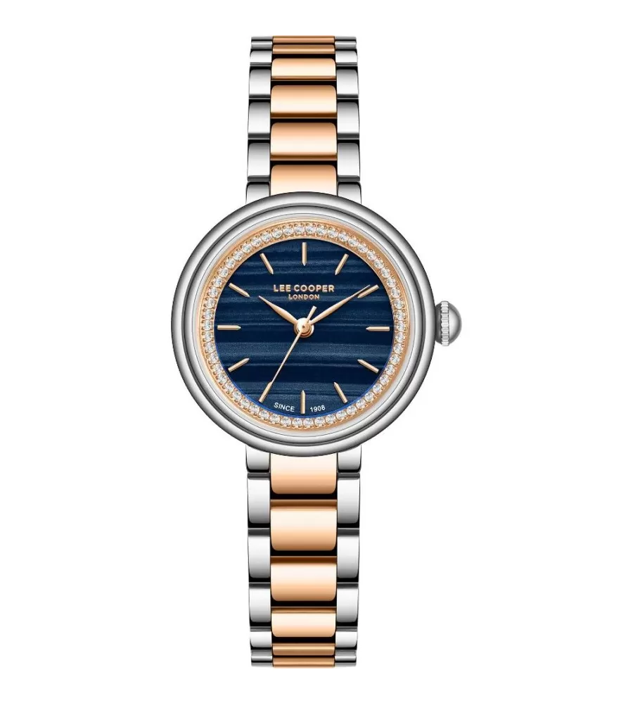 Dámske hodinky Lee Cooper LC08279.590 majú okrúhle kovové puzdro v kombinácii ružovej a striebornej farby, ladiaci kovový náramok. Ciferník je v modrej farbe s imitáciou dreva, doplnený zlatými ručičkami a jemnými indexmi. Hodinky sú poháňané batériovým quartz strojčekom a slúžia len na zobrazenie času bez akýchkoľvek ďalších funkcií. Sú elegantné a vhodné na každodenné nosenie na spoločenské udalosti.