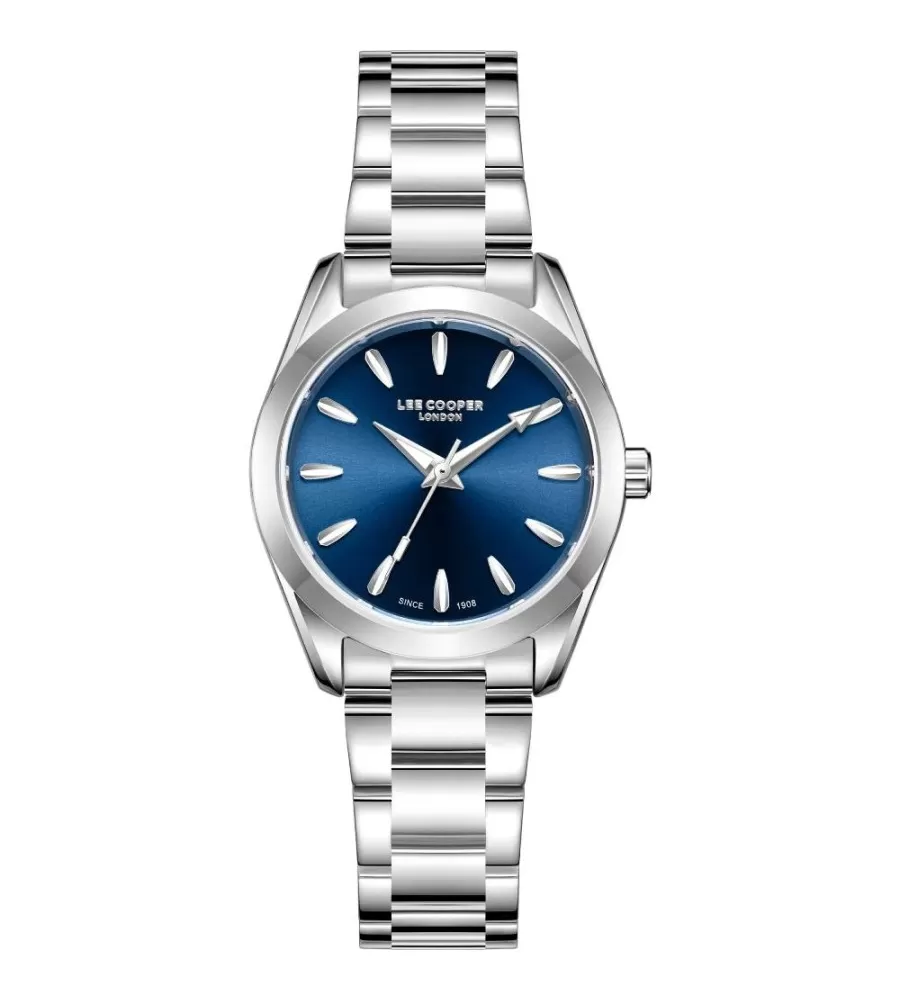 Dámske náramkové hodinky Lee Cooper majú okrúhle kovové puzdro s priemerom 32 mm. Modrý ciferník je chránený minerálnym sklom. Hodinky poháňa quartzový strojček napájaný batériou. Strieborný kovový remienok dodáva hodinkám elegantný vzhľad. Sú odolné voči bežnému kontaktu s vodou, napríklad pri umývaní rúk. Tieto hodinky sú vhodné pre ženy, ktoré hľadajú kombináciu štýlu a praktickej funkčnosti.