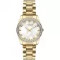 Dámsky náramkový model je zhotovený z kvalitného kovu, ktorý je opatrený PVD povrchovou úpravou vo farbe žltého zlata. Okrúhle púzdro je poháňané kvalitným strojčekom a batériou s dvojročnou životnosťou. Perleťový číselník je vysadený zirkónmi v briliantovom, bruse, ktoré preberajú funkciu indexom hodín. Hodinky sú vhodné na každodenné nosenie aj do spoločnosti.