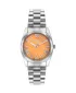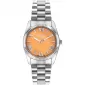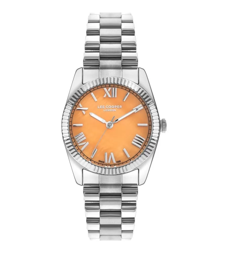 Zaujímavý model dámskych náramkových hodiniek je zhotovený z kvalitného kovu v lesklej povrchovej úprave. Puzdro je poháňané spoľahlivým strojčekom a batériou s dvojročnou životnosťou. Oranžový číselník dopĺňajú jednoduché ručičky a indexy hodín a luminiscenčnou vrstvou. Hodinky sú vhodné na každodenné nosenie aj do spoločnosti.
