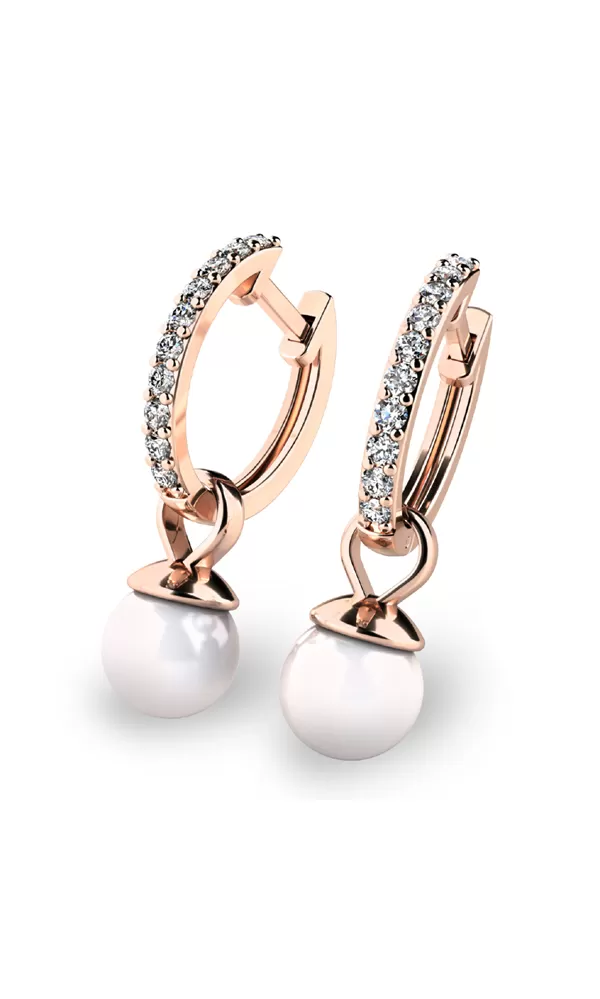 Náušnice kruhy patří mezi velmi oblíbený šperk. Náušnice jsou vhodné pro každodenní nošení i na společenské akce a sluší každé ženě. Tento model je zdoben dvaceti diamanty a dvěmi přírodními kulatými perlami. Diamanty jsou v briliantovém brusu, díky kterému dokonale odráží světlo a neuvěřitelné září. Vsazování diamantů a drahých kamenů provádějí naši nejzkušenější mistři zlatníci ručně pod mikroskopem s přesností na 0,01mm a proto nehrozí vypadnutí kamínků jako to bývá u strojně vyráběných náušnic. Tyto nádherné náušnice jsou vyrobeny z růžového čtrnáctikarátového zlata - 585/1000 v lesklé povrchové úpravě.