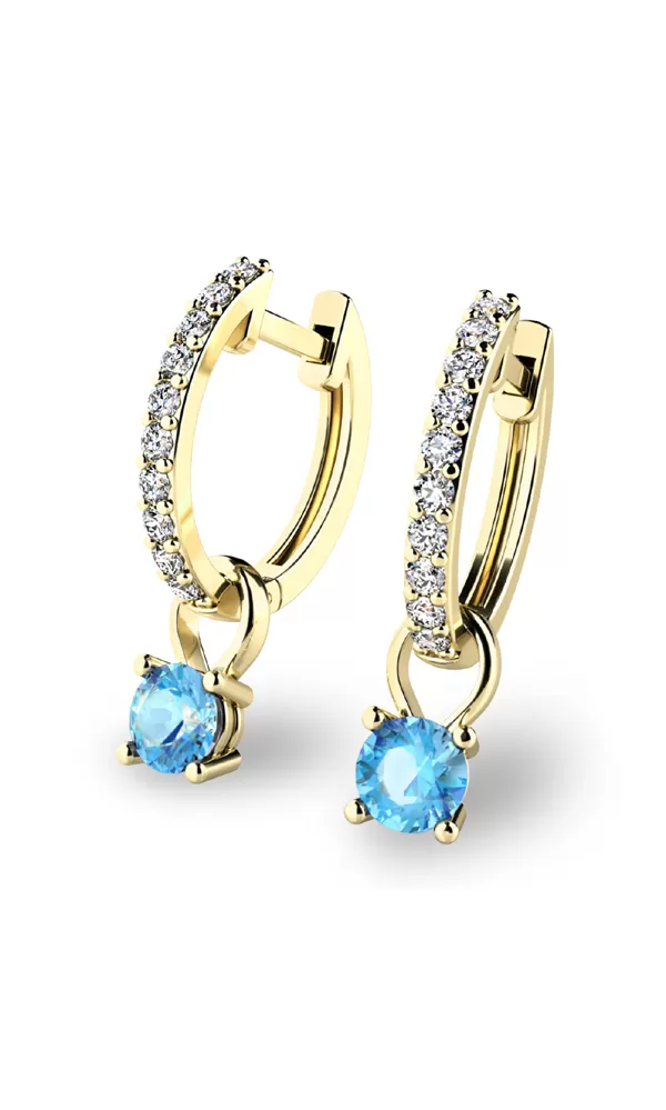 Kruhové náušnice patří mezi velmi oblíbený šperk. Náušnice jsou vhodné pro každodenní nošení i na společenské akce a sluší každé ženě. Tento model je zdoben dvaceti diamanty a dvěma topazy vsazenými do přívěsků. Všechny kameny jsou v briliantovém brusu, díky kterému dokonale odráží světlo a neuvěřitelné září.Vsazování diamantů a drahých kamenů provádějí naši nejzkušenější mistři zlatníci ručně pod mikroskopem s přesností na 0,01mm a proto nehrozí vypadnutí kamínků jako to bývá u strojně vyráběných náušnic. Tyto nádherné náušnice jsou vyrobeny ze žlutého čtrnáctikarátového zlata - 585/1000 v lesklé povrchové úpravě.